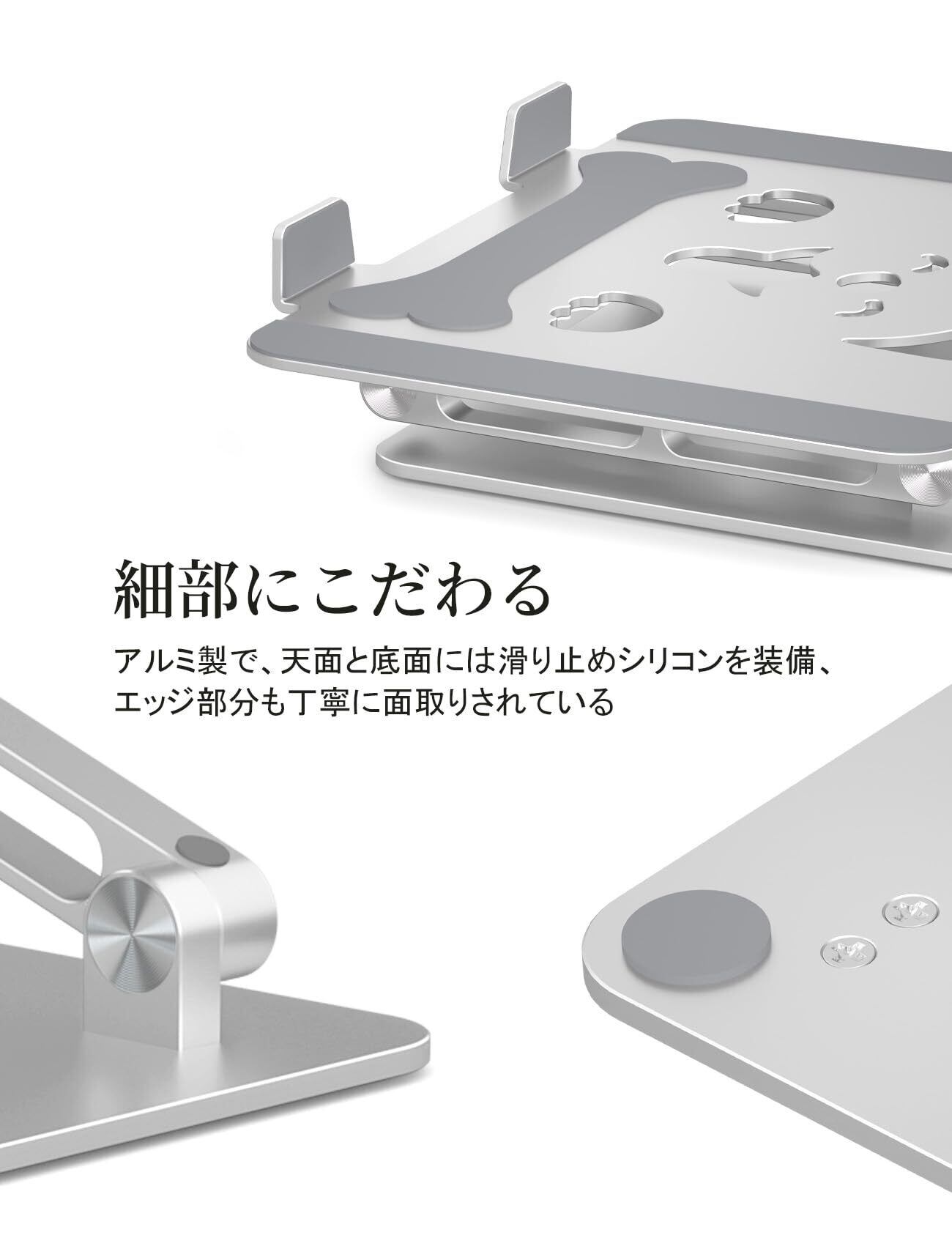 1、【安定性優越&滑り止め&動物系なデザイン】この度ご紹介させていただくノートパソコンスタンドD5は、高品質な6系6063アルミニウム合金を用い、特別な工法にて製造いたしました。表面には繊細なアノード酸化処理が施され、滑らかな手触りを実感いただけます。また、耐久性と堅牢性に優れ、4つの滑り止めラバーと5つの保護用ゴムを装備しております。このデザインは、ブランド主理人ひろまえの愛犬、灵光まからインスピレーションを得ており、柴犬の姿を透かし彫りと骨型シリコンパッドで表現しております。この小さな柴犬の笑顔が、多くの方々に癒しをお届けできることを心より願っております。ノートパソコンをスタンドに置いた際の安定性が高く、快適な作業環境を提供いたします。