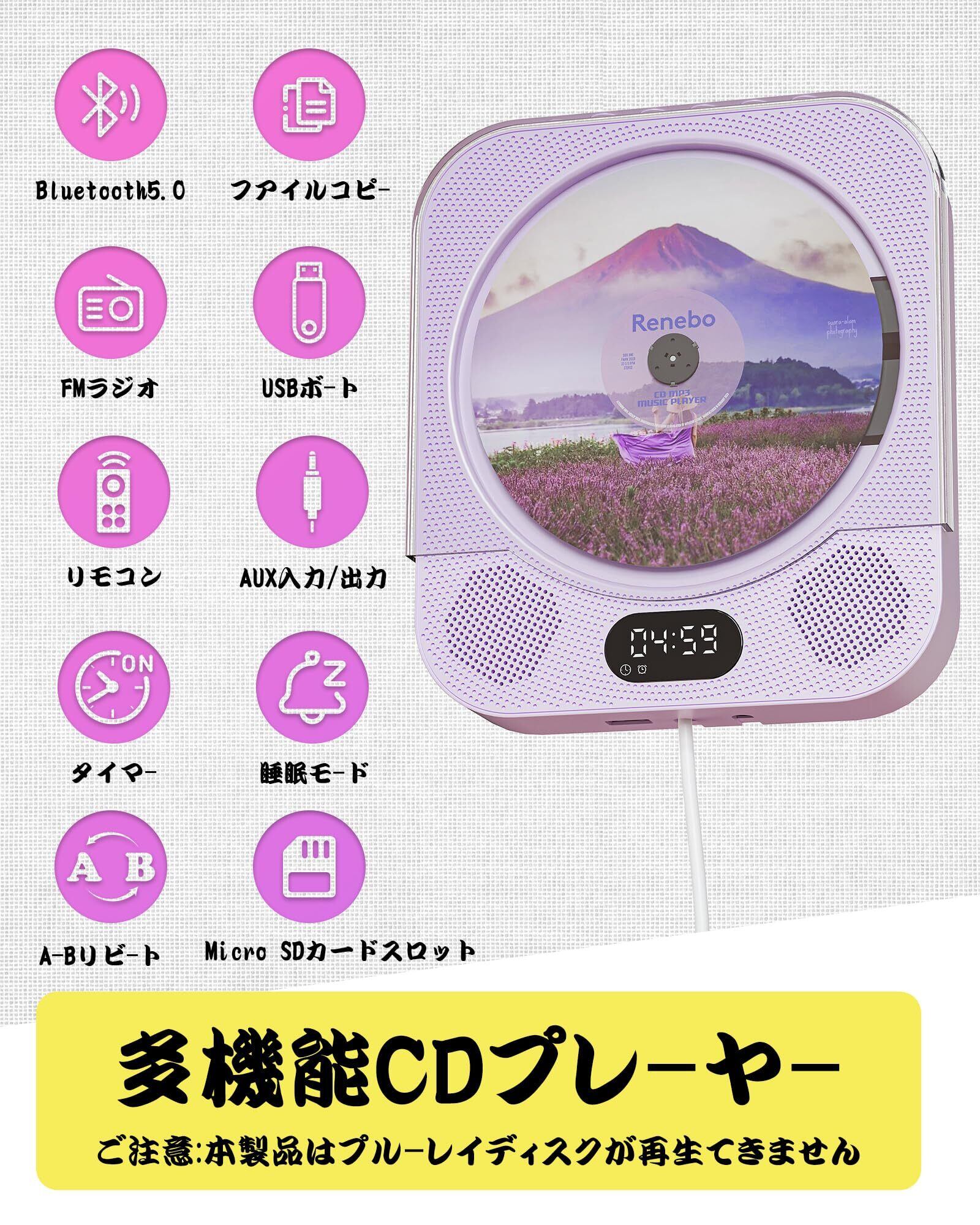 Renebo パープルの卓上CDプレーヤー 可愛い多機能CDプレーヤー 小型有線で壁掛け可能 FMラジオ搭載ブルートゥーススピーカー付き 音楽アラーム コピー機能/CD/AUX/USB対応 LEDディスプレイ/リモコン付き 引き紐式の電源オン/オフ 取り外し可能な防塵カバー 音楽再生/胎教/オーディオブック/語学学習に対応 ギフトに最適 PSE認証 日本語取扱説明書付き