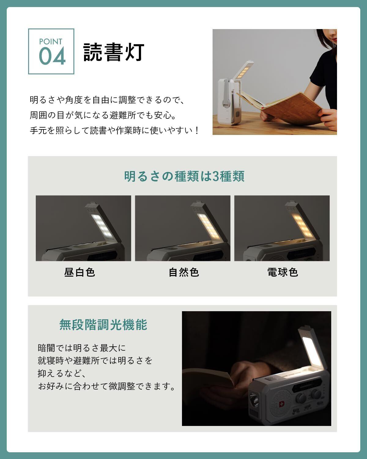 【読書灯】3色切り替え(昼白色、自然色、電球色)、角度自由調整 【ワンタッチライト】急な停電でも安心なLEDライト