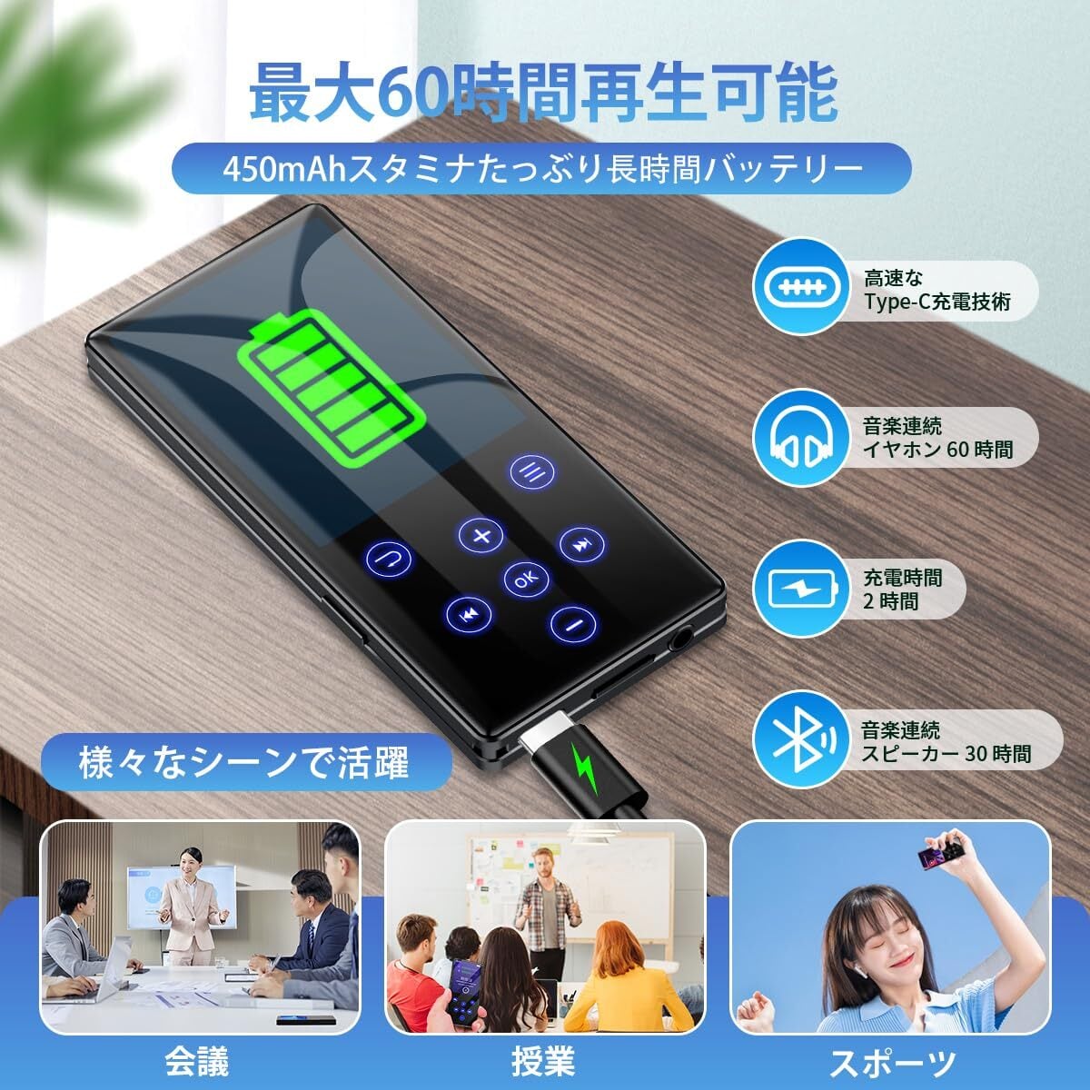 「連続再生時間&コンパクトで携帯便利」MP3プレーヤーはTypeC充電式、専用のTypeC充電ケーブルて急速充電に対応できます;450Aahバッテリーを内蔵、フル充電で音楽が最大40時間で連続再生可能です。重さは86g、最近のスマホは170gぐらいなのでその約半分と考えるとポケットに入れても特に気にならない重さです。持ち運びに超便利で、音楽鑑賞、語学学習、緊急録音、アウトドアスポーツなど様々なシーンで活躍します。(ご注意:再生時間はお客様の使い方によって異なります)
