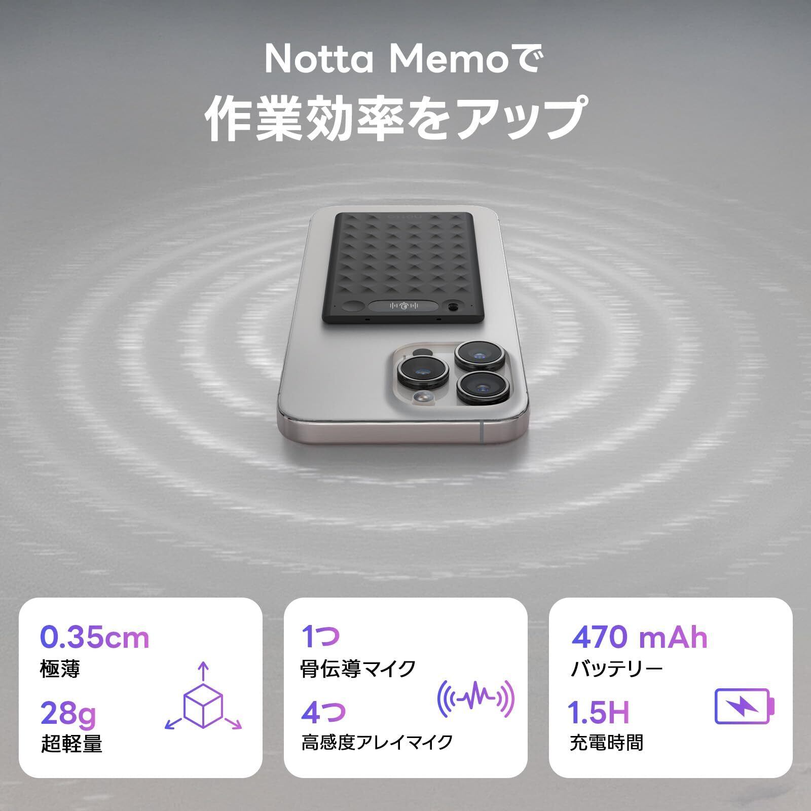 Notta Memo AI ボイスレコーダー ワンタッチ録音 文字起こし/翻訳/要約/話者識別機能 世界の主流言語に対応 通話/会議録音モード 会議・面談・講演内容自動整理 Bluetooth&Wi-Fiデータ自動同期 5つのマイク搭載 スマホ・PCアプリ連携 会議ツール連携可 iPhone&Android対応 専用マグネットケース付属 2000時間録音可能