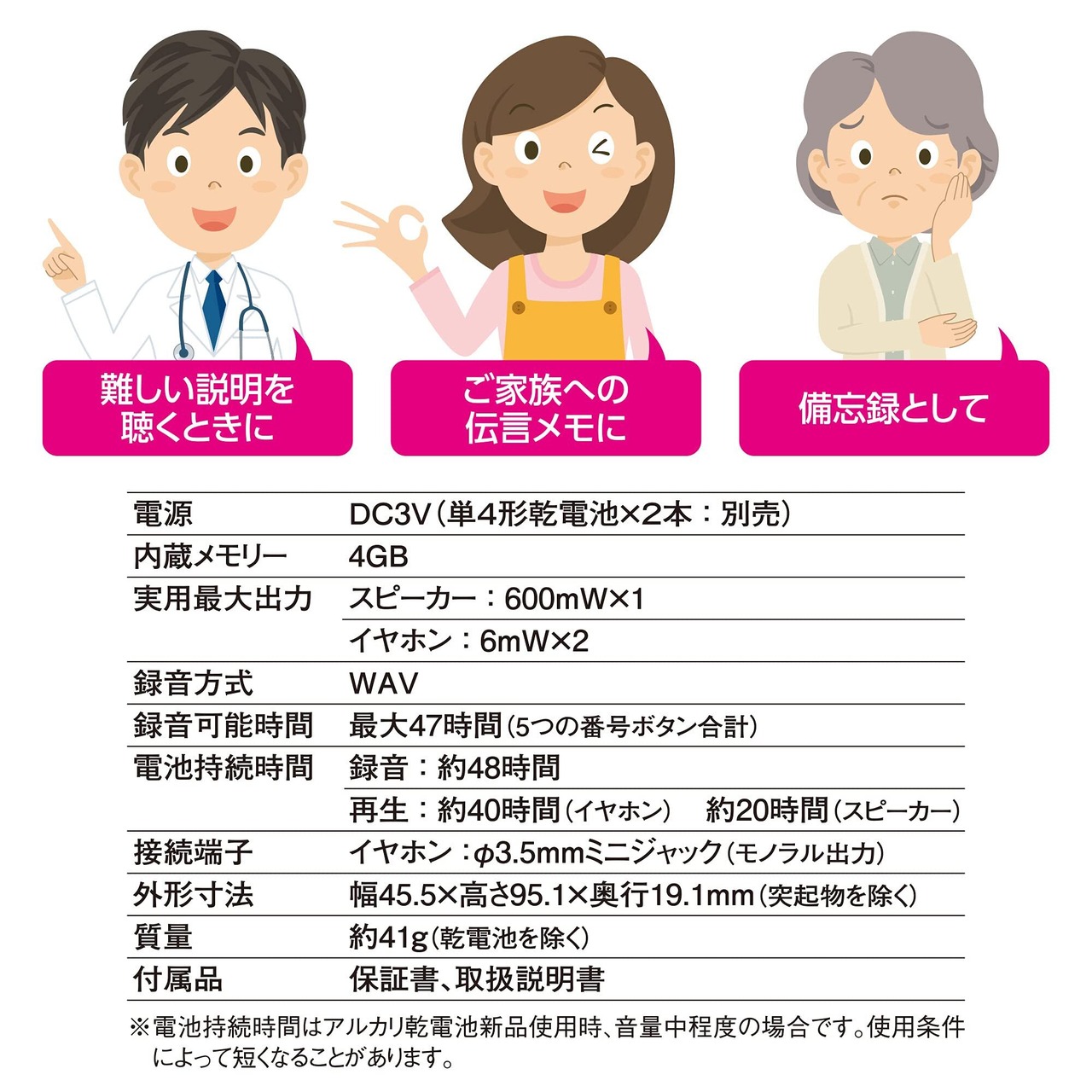 【 特 長 】● 番号ボタンと録音/再生ボタンを順に押すだけの簡単操作● すぐに録音/再生ができるので気軽に音声メモを残せます● 最大録音47時間● 録音件数最大5件● 内蔵メモリー4GB● 乾電池式(単4形乾電池×2本)● モノラルスピーカー内蔵● イヤホン端子付き● マイク内蔵● 誤作動防止のホールド機能付き
