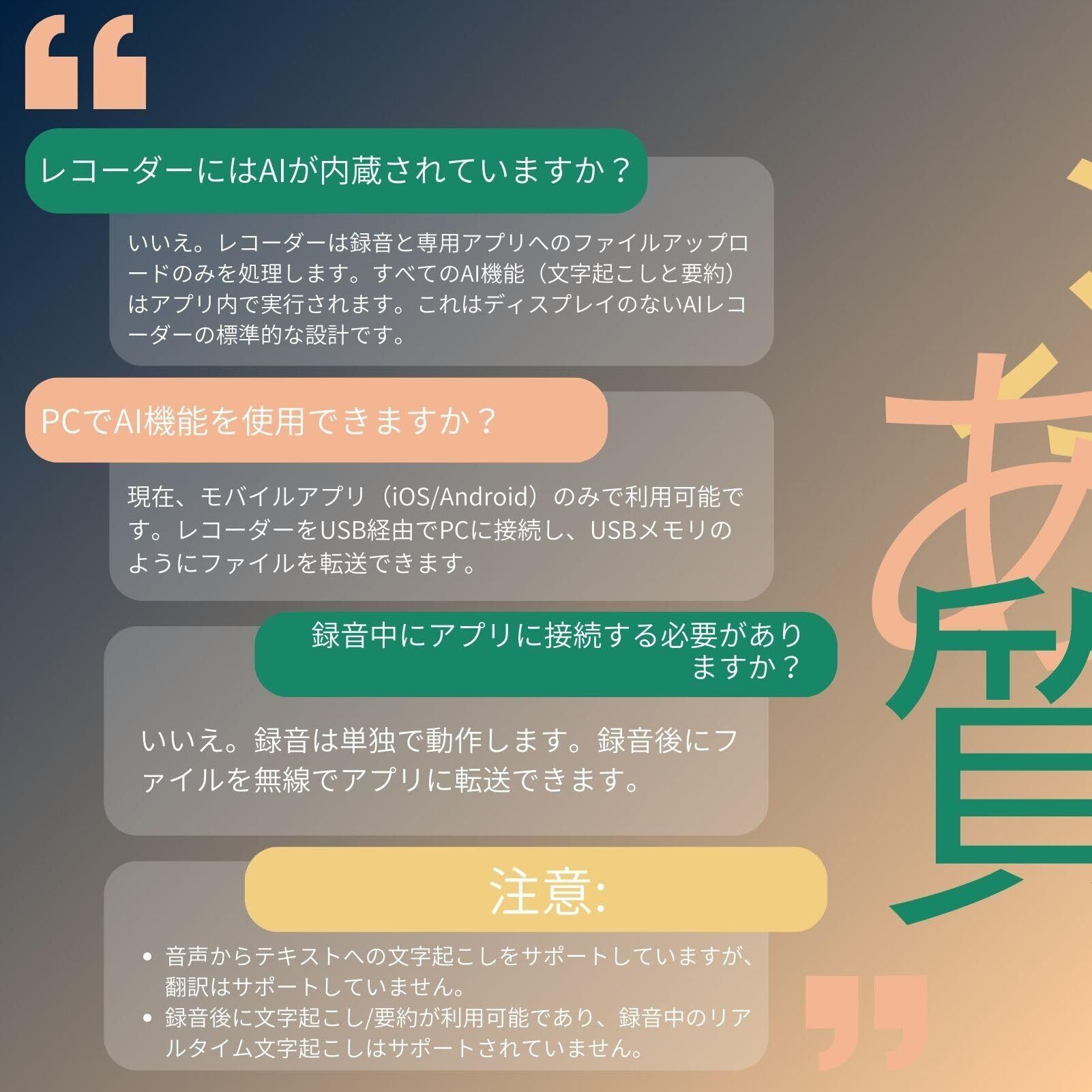 【デュアルマイクノイズリダクション機能付きAIボイスレコーダー】: このプレミアム録音デバイスは、高品質のオーディオをキャプチャするだけでなく、AI音声からテキストへの文字起こしやGPT-4oサマリーなどの高度な機能のための専用アプリに接続し、録音を効率的に管理することがこれまでになく簡単になります。