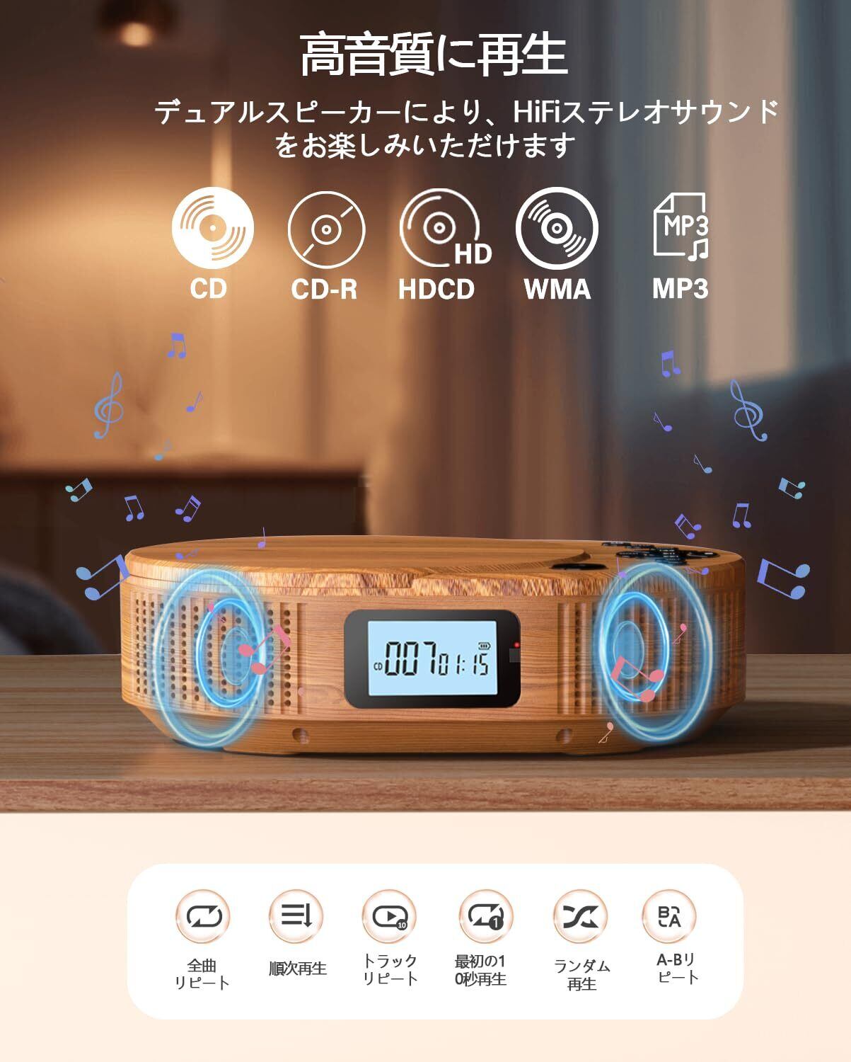 【幅広い互換性とAUX出力対応】 このCDプレーヤーは、CD、CD-R、HDCD、MP3ディスク、CDのWMAオーディオファイル、USB再生など、さまざまなオーディオフォーマットに対応しています。CDプレーヤーだけでなく、スマートフォンやタブレットなどの外部オーディオデバイスから音楽を再生することもできます。また、付属のAUXケーブルを使用することで、外部オーディオデバイスと直接接続し、音楽を再生することができます。このように、幅広いオーディオフォーマットに対応し、外部オーディオデバイスとの接続にも対応しているため、さまざまな音楽に対応し、より柔軟な音楽鑑賞を実現します。(CDを読み込む前に、CDプレーヤーをCDモードに切り替えてください。)