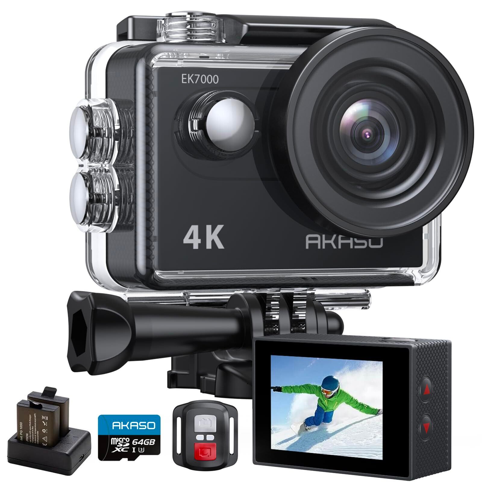 AKASO アクションカメラ EK7000 4K 2000万画素 64GBメモリカード付き 水中カメラ WiFi搭載 外部マイク対応 40M防水 HDMI出力 170度広角レンズ リモコン付き 1050mAhバッテリー2個付き アクションカム ウェアラブルカメラ 豊富なアクセサリー
