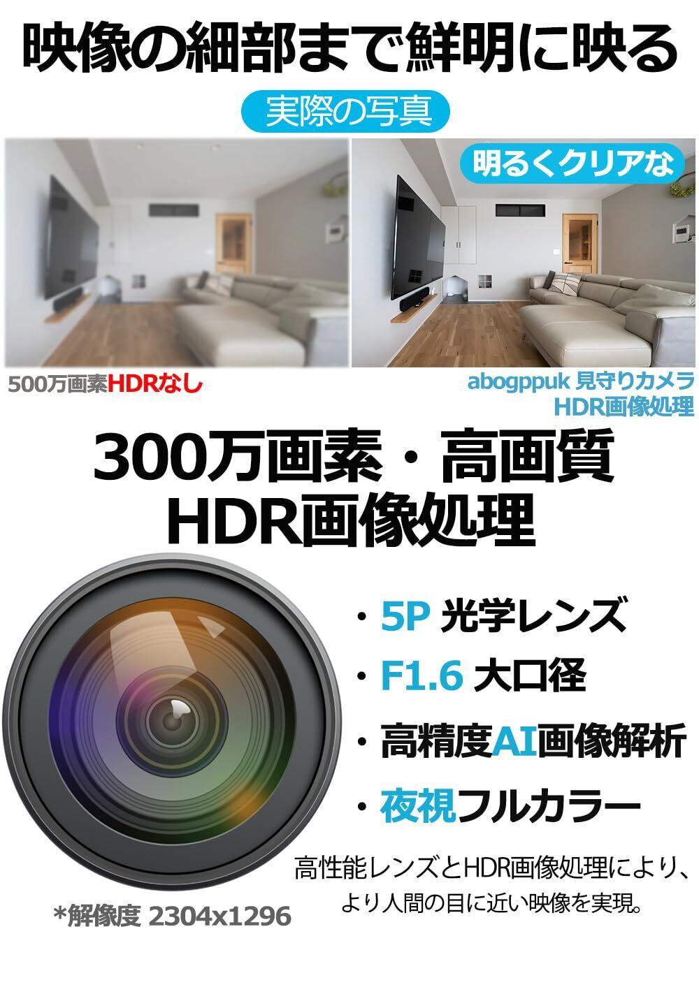 【フルHD 2K・300万画素・HDR画像処理】:高性能カメラ*2、5P 光学レンズ、F1.6 大口径、HDR画像処理、解像度 2304x1296。また、デジタルワイドダイナミックレンジ機能を備えており、逆光環境下でもクリアな映像を提供します。