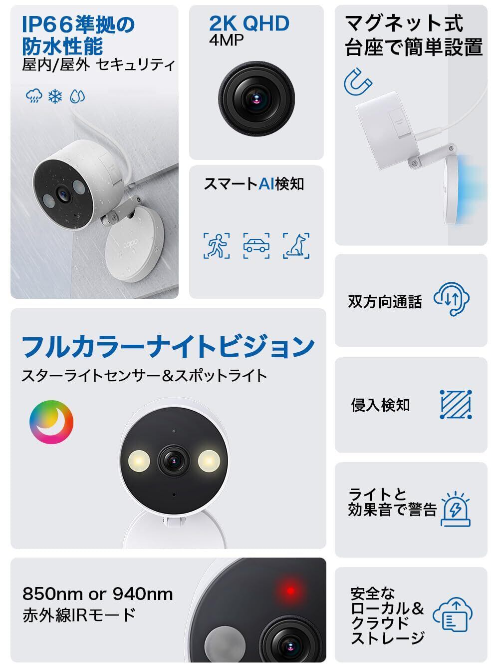 【特徴】 屋内/屋外兼用の2KQHD高画質カメラが登場。2つのライトがついていて夜間での明るい撮影もできるかわいいカメラがTapoファミリーに加入しました!