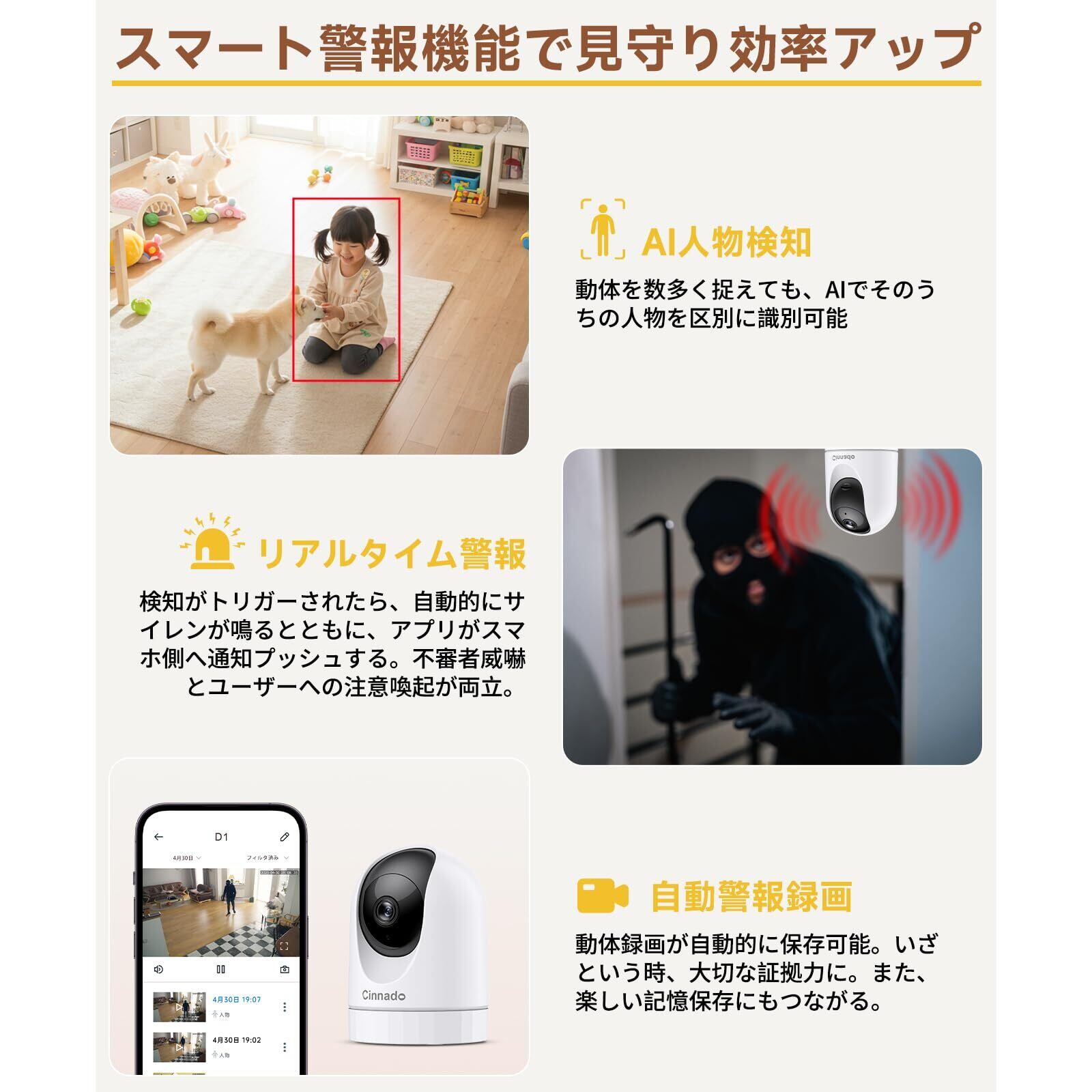 Cinnado【2025モデル】D1ペットカメラ300万画素 2K HD ベイビー/犬/猫モニター ワイヤレス屋内防犯 監視360度 ベビー 老人 子供 ペット見守り 2.4GWi-Fi対応 スマホ対応 iphone対応 Alexa対応 動体検知 双方向音声通話 暗視撮影 録画可能 クラウド保存対応 白