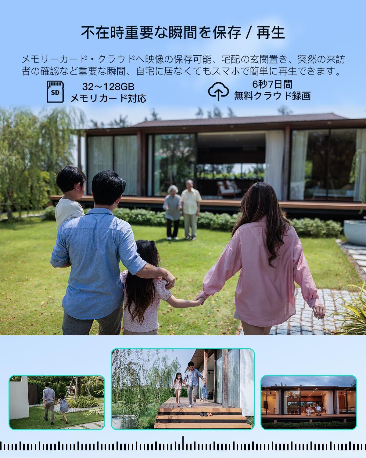 【PTZで広範囲の見守り●無料6秒クラウドに録画●4倍速再生】セキュリティカメラはパン・チルト設計により、死角のない360度のパノラマ視野を実現し、スマホでレンズを自由自在に動かして広範囲の撮影が可能です。裏庭を監視する場合でも、ガレージの安全を確保する場合でも、シャープな鮮明さと広い監視範囲で際立っています。安全で便利なローカル(128GBまで)メモリカード(別売り)と最大7日間の無料クラウドストレージストレージオプションを提供します。訪問介護の来訪や宅配の玄関置き、突然の来訪者の確認など重要な瞬間を保存します。また4倍速の再生速度で録画映像を迅速に確認し、効率的に情報を取得できます。データとプライバシーの保護は当社の最優先事項です。より強力な暗号化と認証手法が導入され、より高いセキュリティレベルを提供しています。