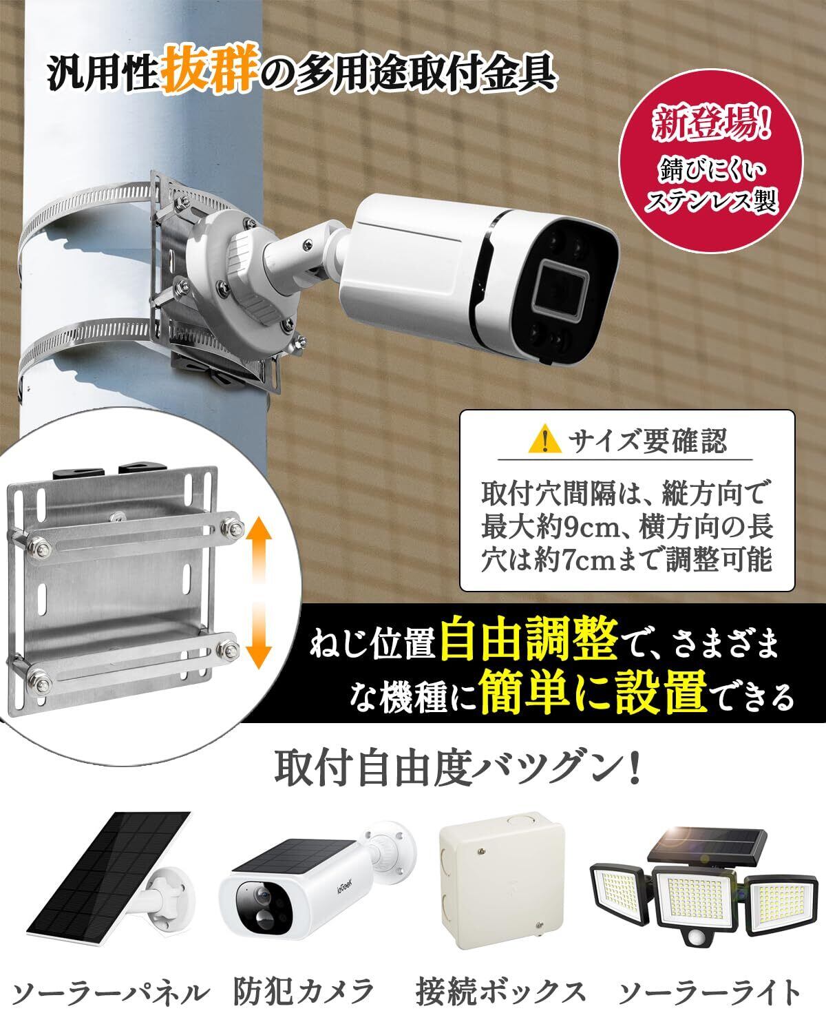 【耐久性抜群】二重の滑り止めゴムが、カメラブラケットのズレをしっかり防止し、ネジの緩みによる落下リスクを低減します。取付金具はサビに強いステンレス製で、豪雨や強風といった過酷な屋外環境でも安心して使用可能です。長穴入りプレートの穴の長さ(幅)は約7cm、2本のプレートの上下間隔は、最大約9cmまで調整できます。