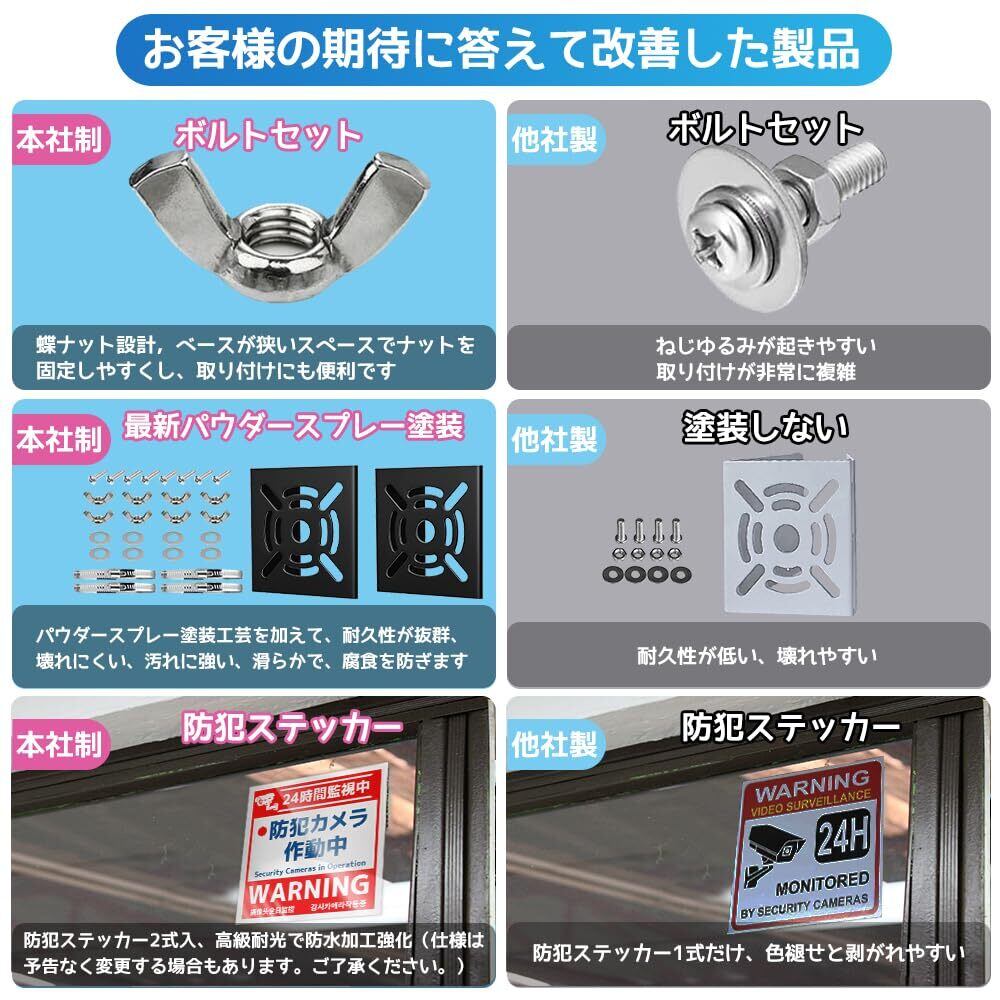 【セット内容】:カメラ ブラケット スタンド(取付金具)x2、ステンレスバンド4本(サイズ直径:200mm)、M4ステンレスボルト8セット(M4x22mm)、ステンレス蝶ナットM4x8セット、ステンレスワッシャーx8セット(M4x12mmx1mm)、防犯ステッカー2枚(3種類)、日本語取扱説明書x1枚。適合の取り付ける環境:室内/室外にサポートします。