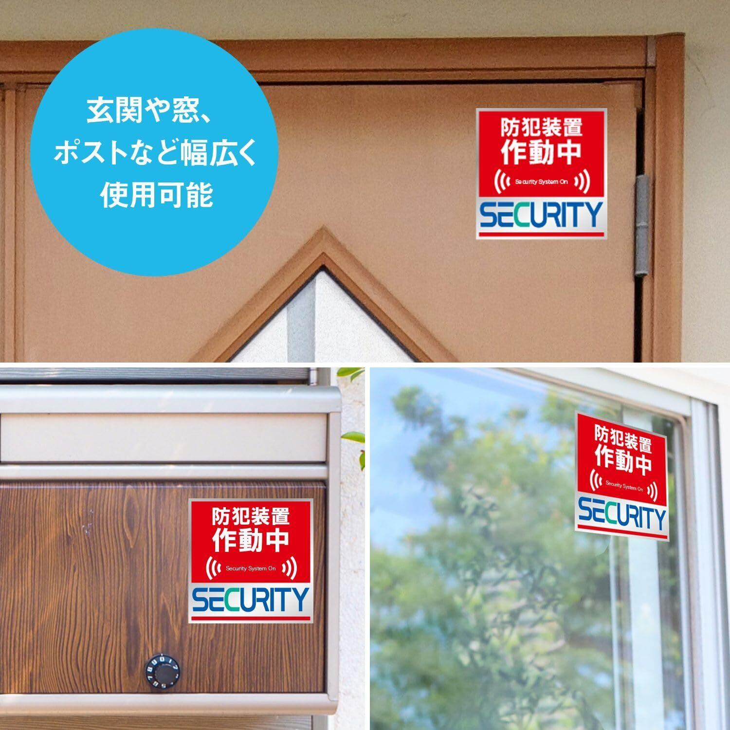 【目立つ赤色×白字デザイン】赤ベースに「防犯装置作動中」の白文字が映え、遠くからでもしっかりと視認できます。SECURITYロゴ入りのデザインで、国内外問わず警告メッセージが伝わりやすく、不審者の接近を抑止する効果が期待できます。