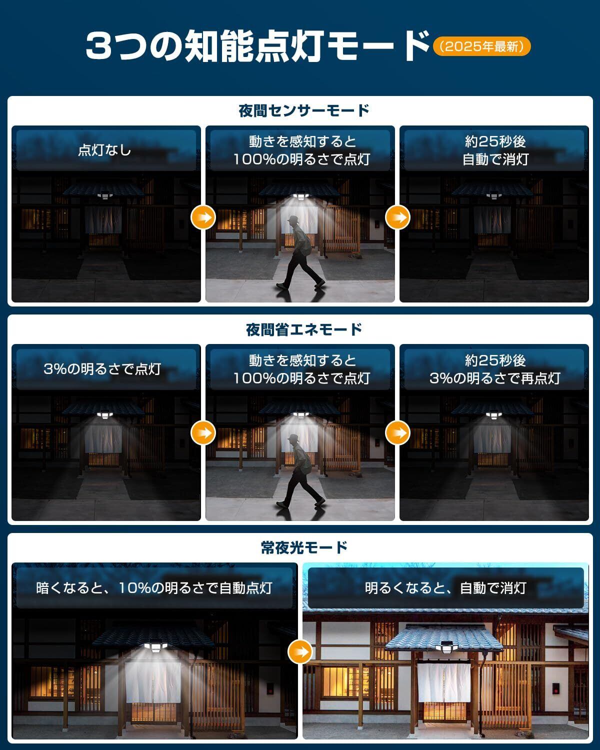 【3つの点灯モード・リモコン操作可能】センサーライト 屋外は配線不要、コンセントから給電する必要がなく、好きな場所に自由に設置できます。付属のリモコンで簡単に3つのモードを切り替えられます。● 夜間センサーモード :人や動物、車の動きを感知すると自動的に高輝度100%で点灯し、動きがなくなると約25秒後に自動で消灯。● 常夜光モード:周囲が暗くなると、自動的に輝度10%で点灯し、周囲が明るくなると自動消灯します。● 夜間省エネモード:暗くなると低輝度3%で点灯し、動きを感知すると自動高輝度100%に切り替わり、動きがなくなる約25秒後に低輝度3%に戻ります。