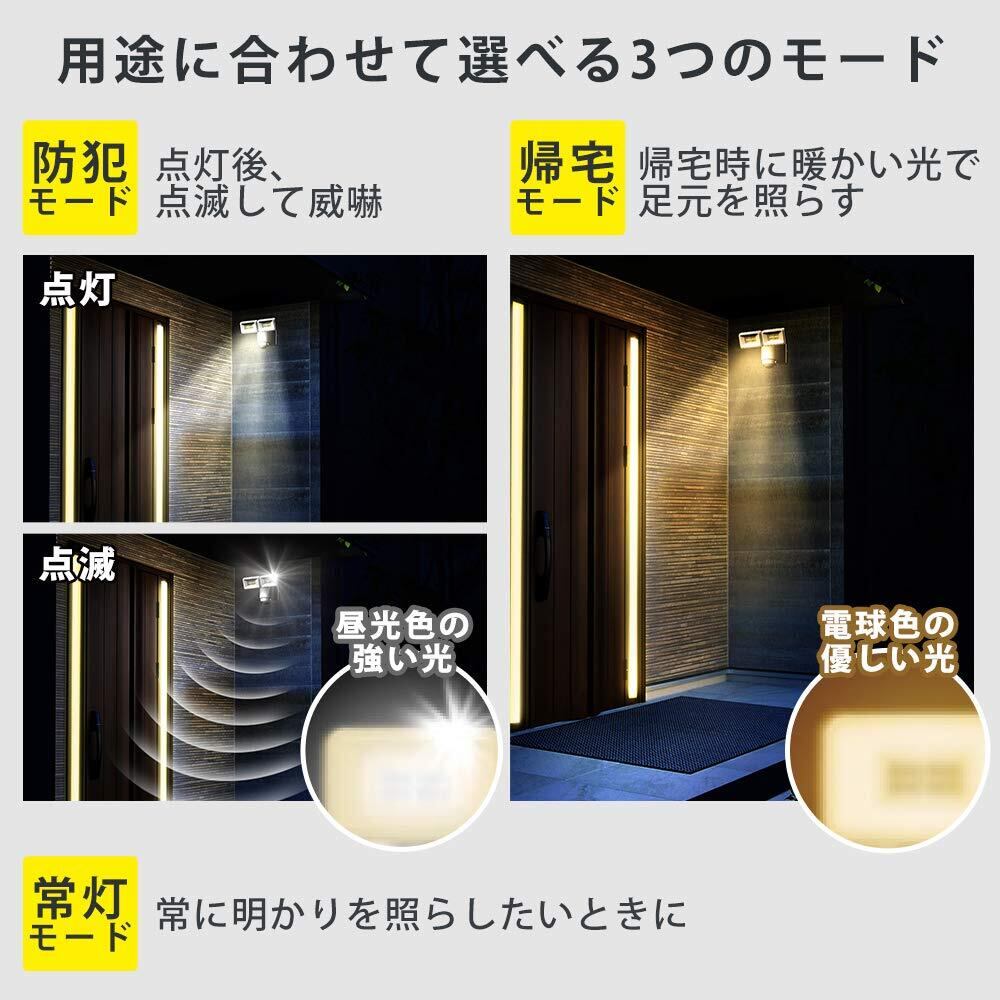 点灯モード切替:防犯モード/常灯モード/帰宅モード・明るさ切替:強/弱(強の半分の明るさ)・点灯時間:約5秒~約5分、連続