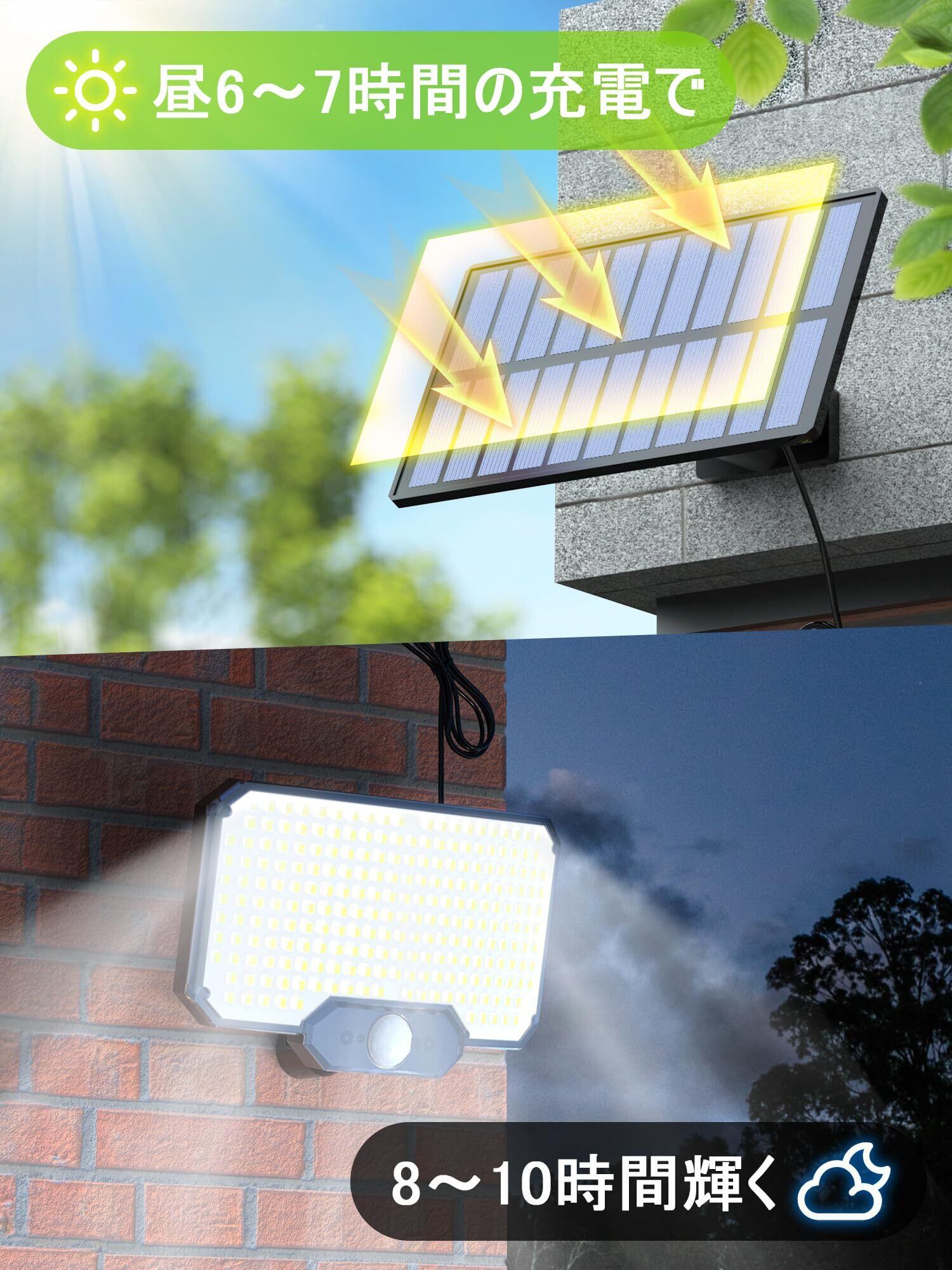【分離式デザイン & 5m延長コードで自由な設置が可能!】 従来の一体型ソーラーライトとは異なり、本製品は分離型デザインを採用。 5mの超長延長コード付きで、ソーラーパネルとライトを別々に設置可能! 例えば、ライトは屋根の下やガレージ内に、ソーラーパネルは日当たりの良い場所に 設置することで、充電効率が大幅アップ! どんな環境にもフィットする、より柔軟なレイアウトが可能 です。