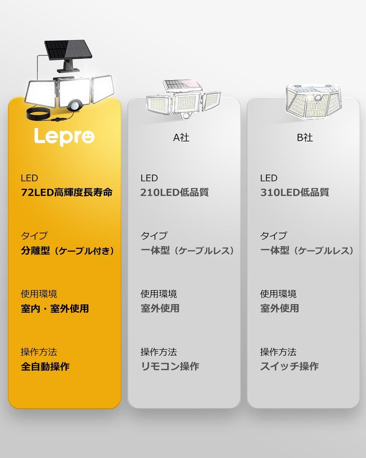 Lepro ソーラーライト 人感センサーライト 防犯ライト ガーデンライト 3灯式 屋内・屋外使用可 夜間自動点灯 昼間自動充電 人が離れたら自動消灯 4.8Mケーブル 1000ルーメン 超高輝度 角度調整 120°感知角度 270°発光範囲 IP65防水 省エネ 壁掛け式 電源不要 駐車場/玄関/軒/庭/ガレージ 防災・停電対策 最新一体・分離型 単品 ブラック