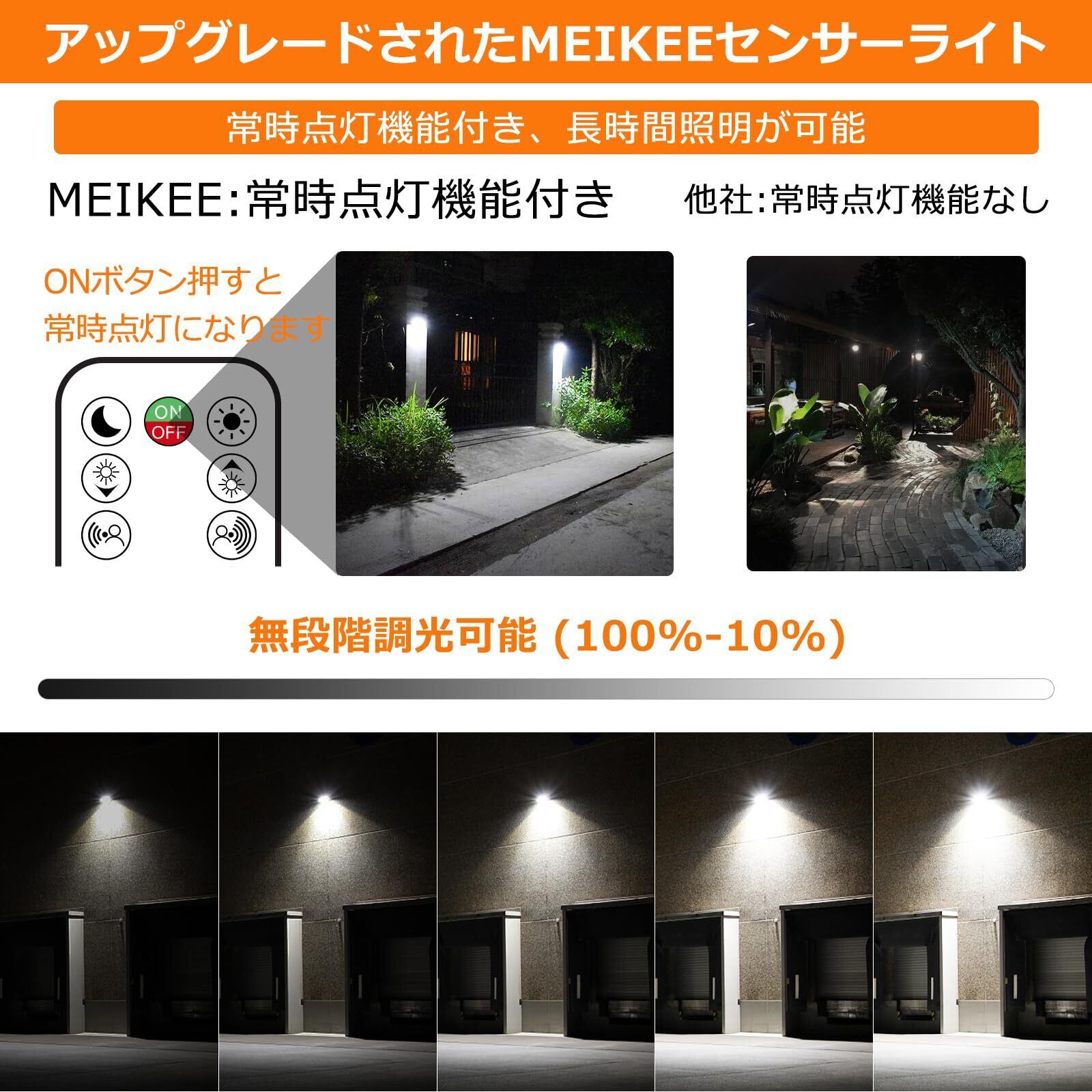 ご注意点:人や車が頻繁に通り過ぎる場所に設置しないでください。そうでなければ、ライトの性能負担、損失は比較的大きく、点灯したまままたは点滅繰り返してを引き起こす可能性があります。MEIKEEの商品をお買い上げ日より、2年間のサービスを提供いたします。何か問題などが御座いましたら、お手数をおかけして恐縮ですが、注文番号、質問内容を添えて【アカウントサービス】-【注文履歴】-【販売:MEIKEE-JP】-【質問する】のほうでお気軽にまでご連絡くださいますようお願い申し上げます。