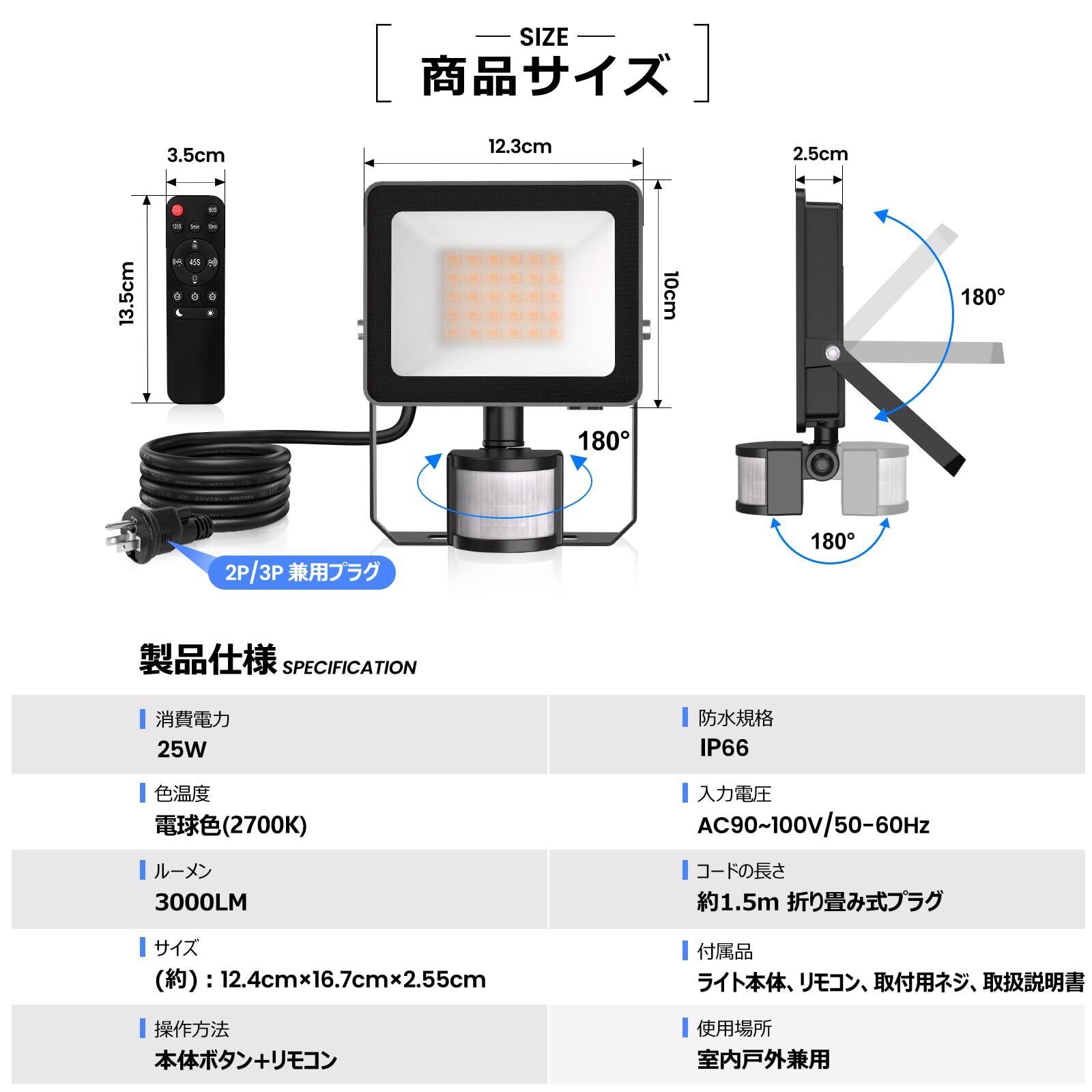 ➤◆【製品の仕様】製品の仕様:➀消費電力:25W➁LEDの色:電球色➂人感センサーモード/常時点灯モード➃点灯時間+検知距離+稼働モード+明るさ調整可能➄配光角:120°➅防水レベル:IP66防水仕様➆1H/2H/3Hタイマー機能➇サイズ:(約):12.4cm×16.7cm×2.55cm➈操作方法:リモコン操作/本体ボタン操作(2way)➉使用用途:玄関、倉庫、アプローチ、駐車場、軒下、ベランダ、階段、地下室、側道、裏側など屋外のあらゆる場所にご使用頂けます。防犯や照明などにも役に立ちます。夜でも明るくなり、防犯性が高まったと感じますので、暗い方にはお勧めします。センサーライトには監視カメラも合わせて取り付けてもいいです。真夜中でも画面までハッキリと記録が出来ます。また、センサ―ライトは車に反応して点灯するので車庫入れがしやすくなり、ベランダや庭で夜に洗濯物を取り込むときにも便利です。ライトアップ目的なら玄関前の植え込みやテラスに設置すると、不審者が近づきにくい雰囲気にもなります。