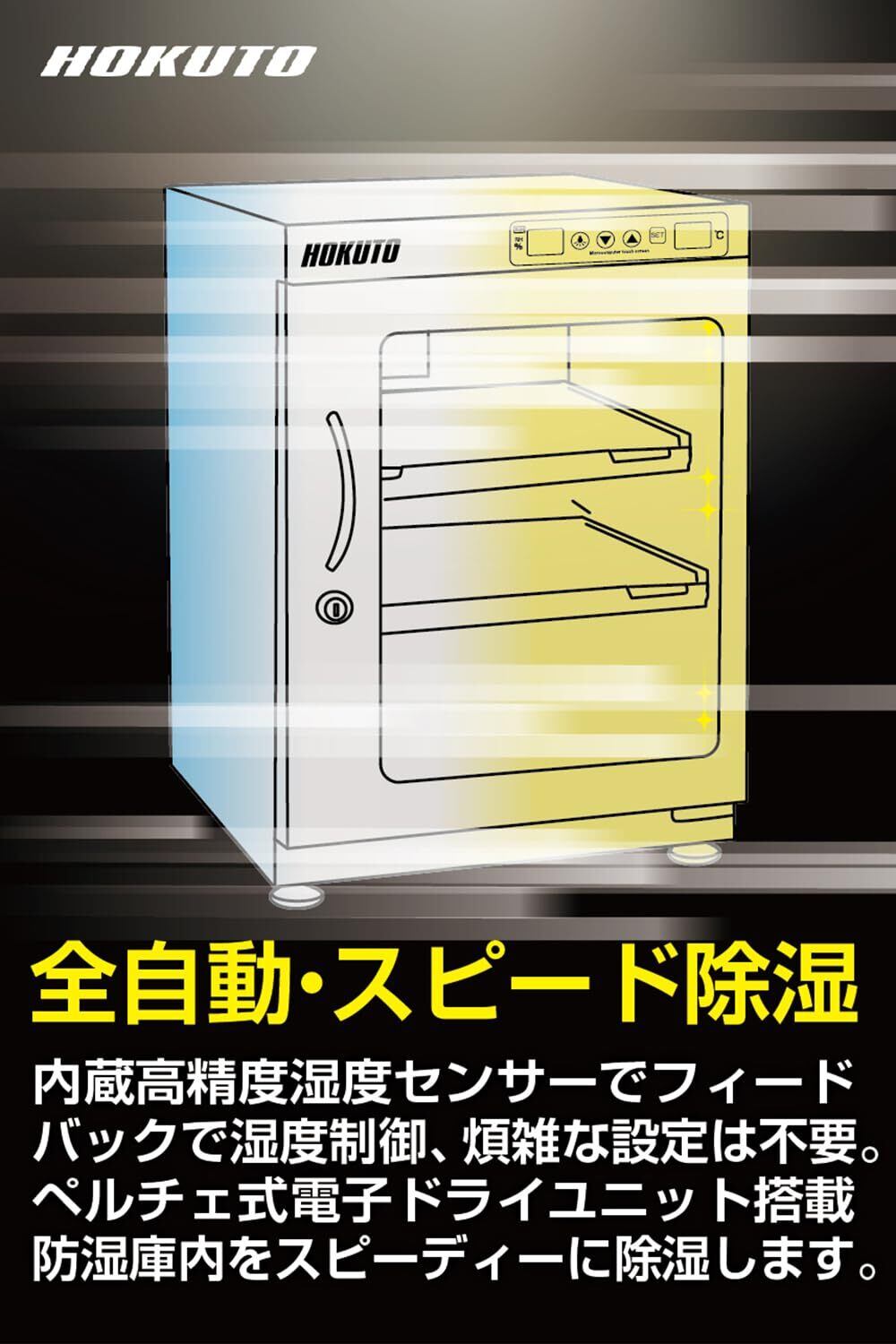 【10. 高気密キャビネットでホコリを軽減&長期間の保管が可能】 湿度管理機能に加え、高い気密性を備えたキャビネット構造によりホコリの侵入を防止。カメラ・レンズを清潔に保ち、カビや錆の発生を抑えて機材の寿命を大幅に延ばします。 ________________________________________ HOKUTO防湿庫はこんな方におすすめ! 大切なカメラやレンズをカビ・湿気から守りたい方 収納しながら充電したい方、機材の管理を効率化したい方 子供やペットのいたずら、ホコリの侵入を防ぎたい方 静音&省エネの防湿庫を探している方 カメラを守るならHOKUTO防湿庫! 高性能な湿度管理で、あなたの大切な機材を長期間保護します。
