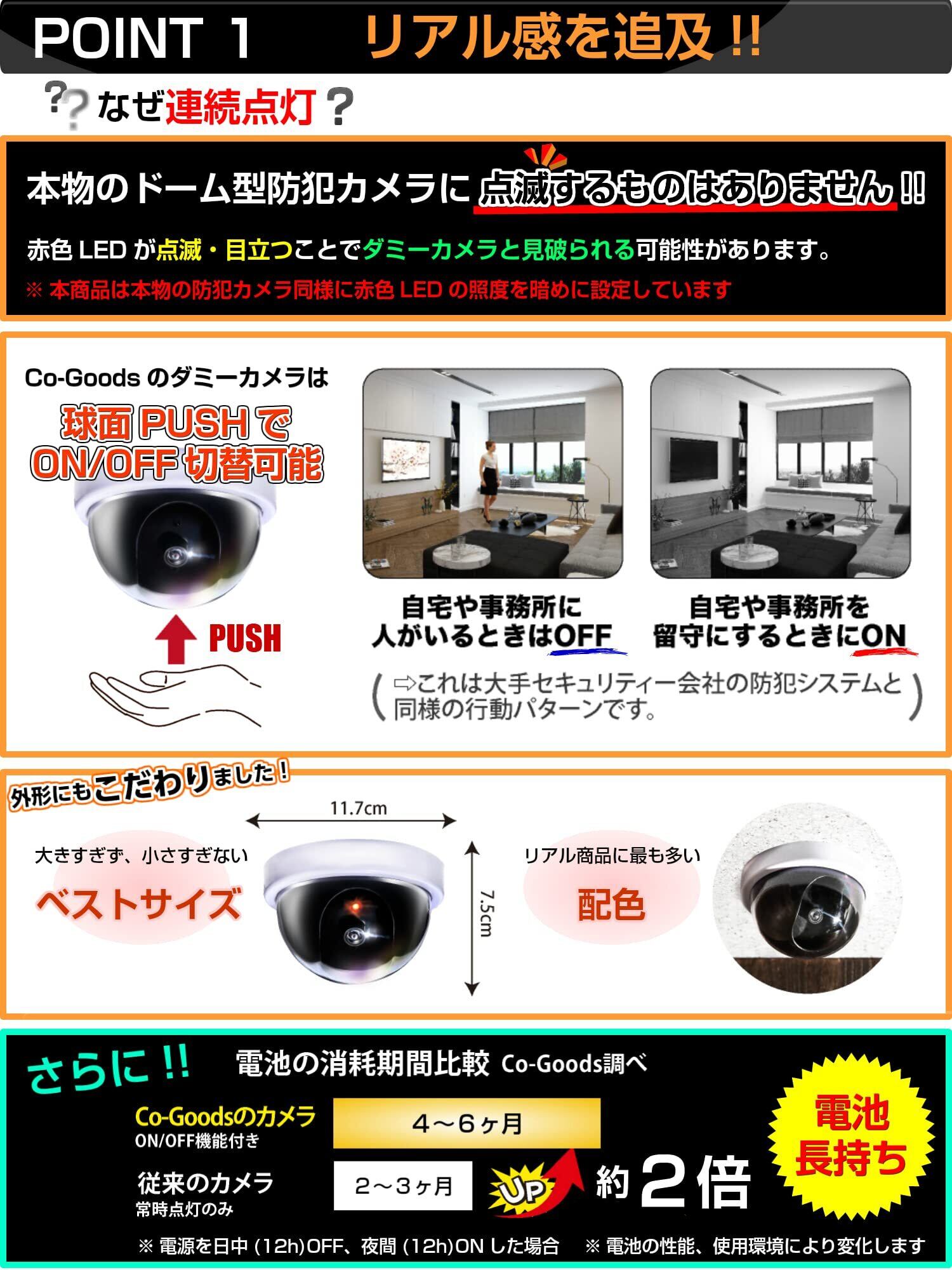 【本物の 防犯カメラ (ドーム型) に、赤色LEDが「点滅する」商品はありません!! ご注意ください】 ダミー防犯カメラ が市場に流通し10数年、ネットに情報が出回るほど「点滅LED = ダミーカメラ 」という情報が蔓延しております。そもそも、リアル防犯カメラのうち、特にドーム型の商品にLEDが点滅する商品は有りません。Co-Goods ダミーカメラ (ドーム型)は現在のリアル防犯カメラの仕様を研究し、 「電源ONの間は赤色LED常時点灯」 、 「リアル商品と同じように明るすぎず暗すぎないLED照度」 「長寿命LED」 の仕様を採用しております。 【手軽に電源ON/OFF切替】 球面を押すだけで点灯LEDの ON/OFF を切り替えることが出来ます。お勧めの使用方法は、大手セキュリティー会社の防犯システム同様、 「在宅時はOFF 、不在時はON」 や 「日中はOFF 、夜間ON」 の様な使い方で 犯罪者への脅威・威嚇UP 使用電力の削減 などが期待できます。 .