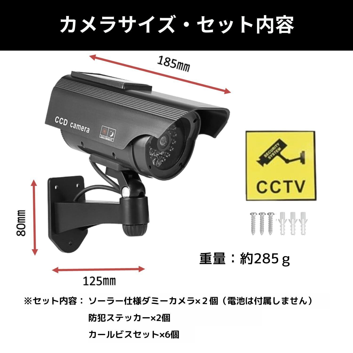 点滅するLEDライト:ソーラーシステムまたは電池で駆動する点滅するLEDライト。これにより、本物のセキュリティカメラのように盗難や破壊行為を抑止する事ができます。
