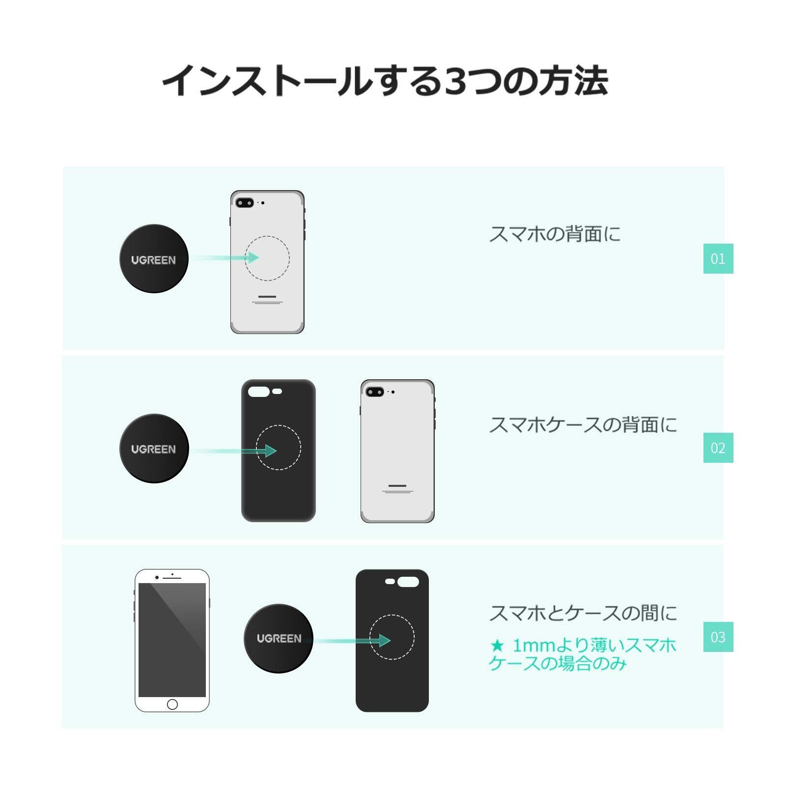 取り付けも簡単、スマホケースの裏面や外面、スマホ本体の裏面に貼り付けます。ご注意:ワイヤレス充電機種には、本体裏面のワイヤレス充電センサーから離れて貼ってください。スマホケースの場合は厚さ1mm未満のケースしか対応しません。