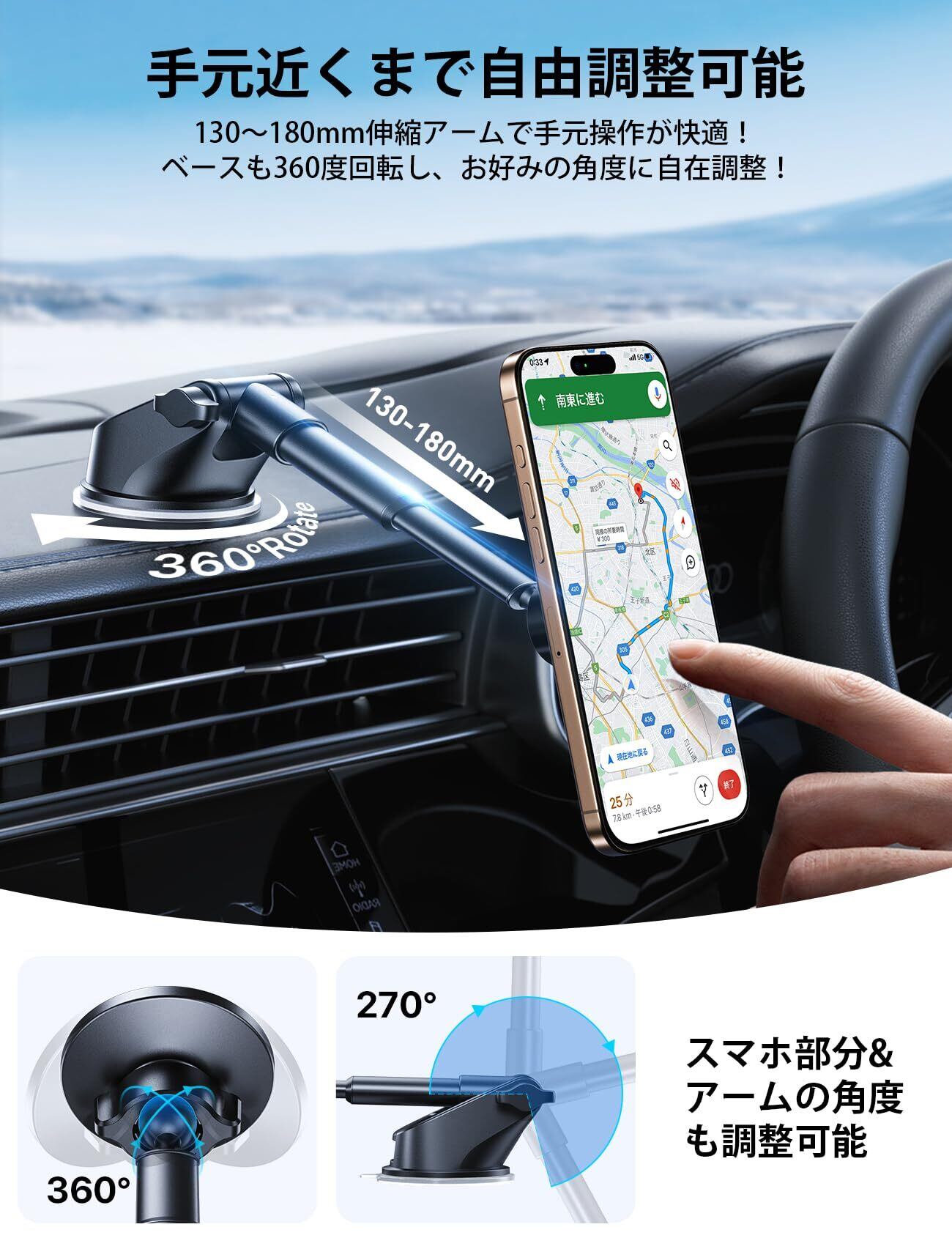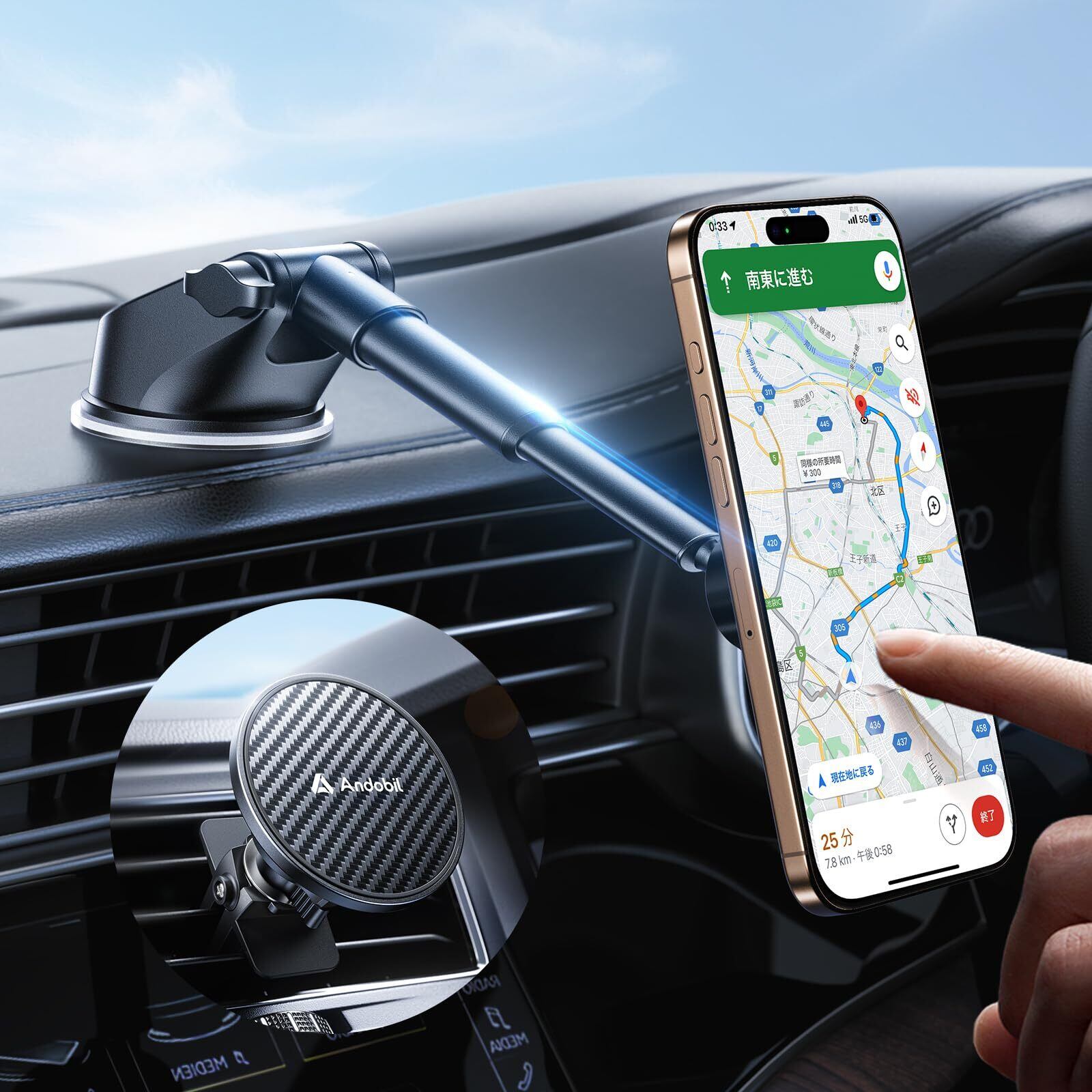 【2025年傑作・吸着力60kg&伸縮アーム搭載】Andobil スマホホルダー 車 マグネット スマホスタンド 車 【真空吸盤&送風口兼用 】 Magsafe 車載スマホホルダー 40個の強力なN55磁石 カー用品 車載ホルダー 取付簡単 片手操作 携帯ホルダー 360度調整 iPhone SE 16 15 14 13 12 Pro Max Xperia AQUOSなど全機種対応