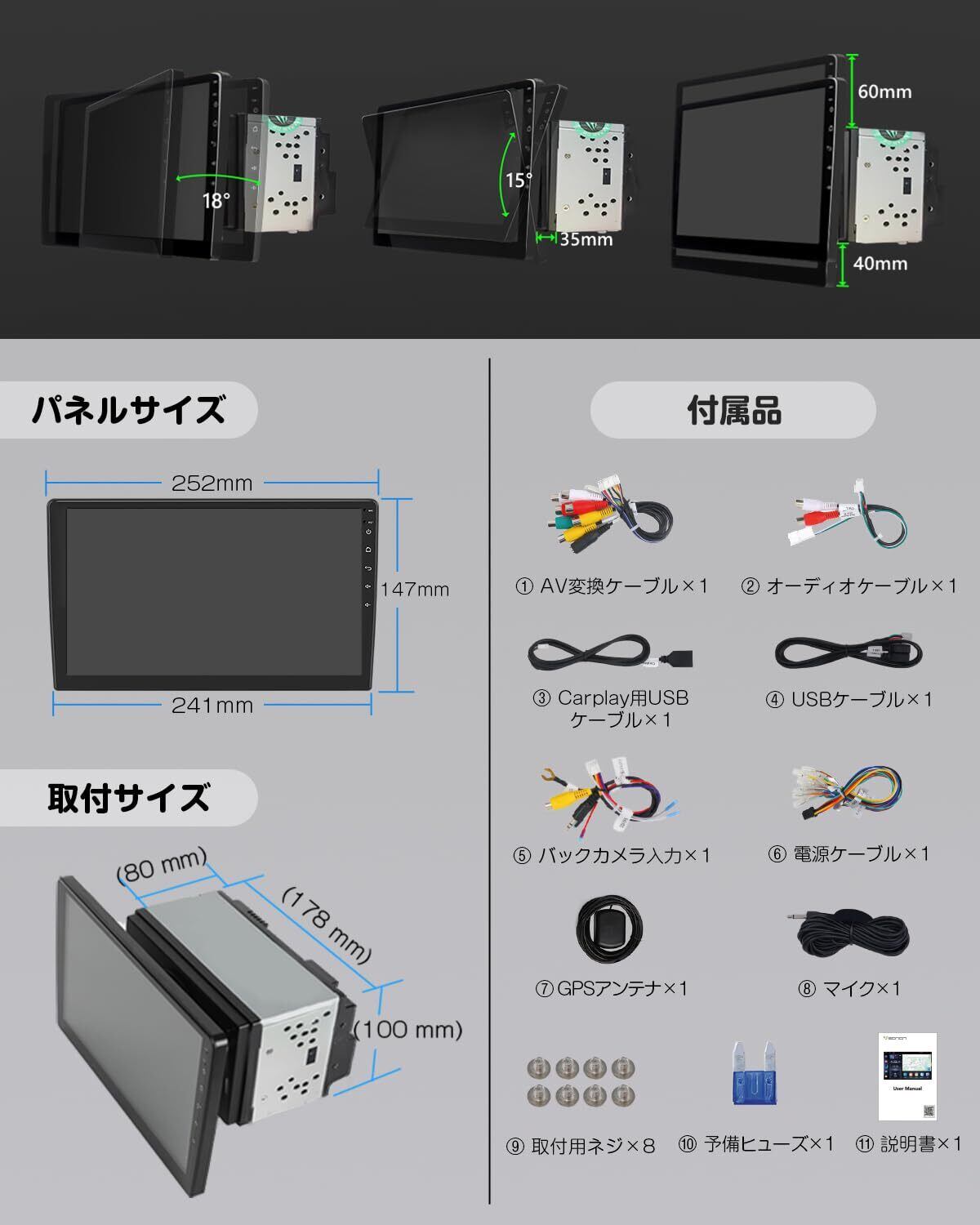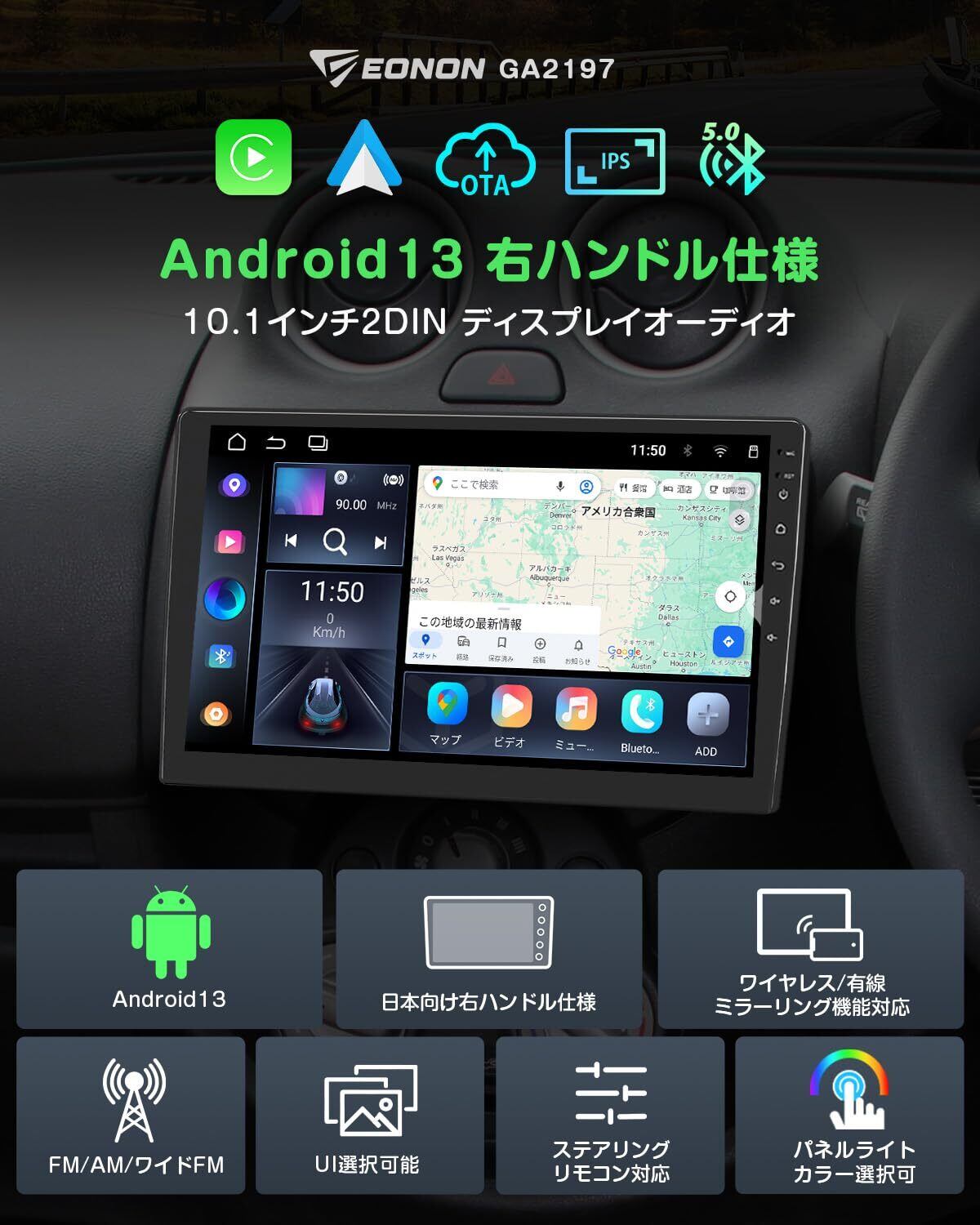 10.1インチIPS大画面, Google Mapsなどの地図アプリはダウンロード可能, 日本向け右ハンドル仕様, エネルギー効率の高いプロセッサー, ワイヤレス&有線Android Auto/CarPlay対応、