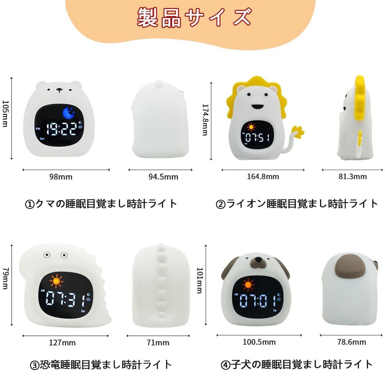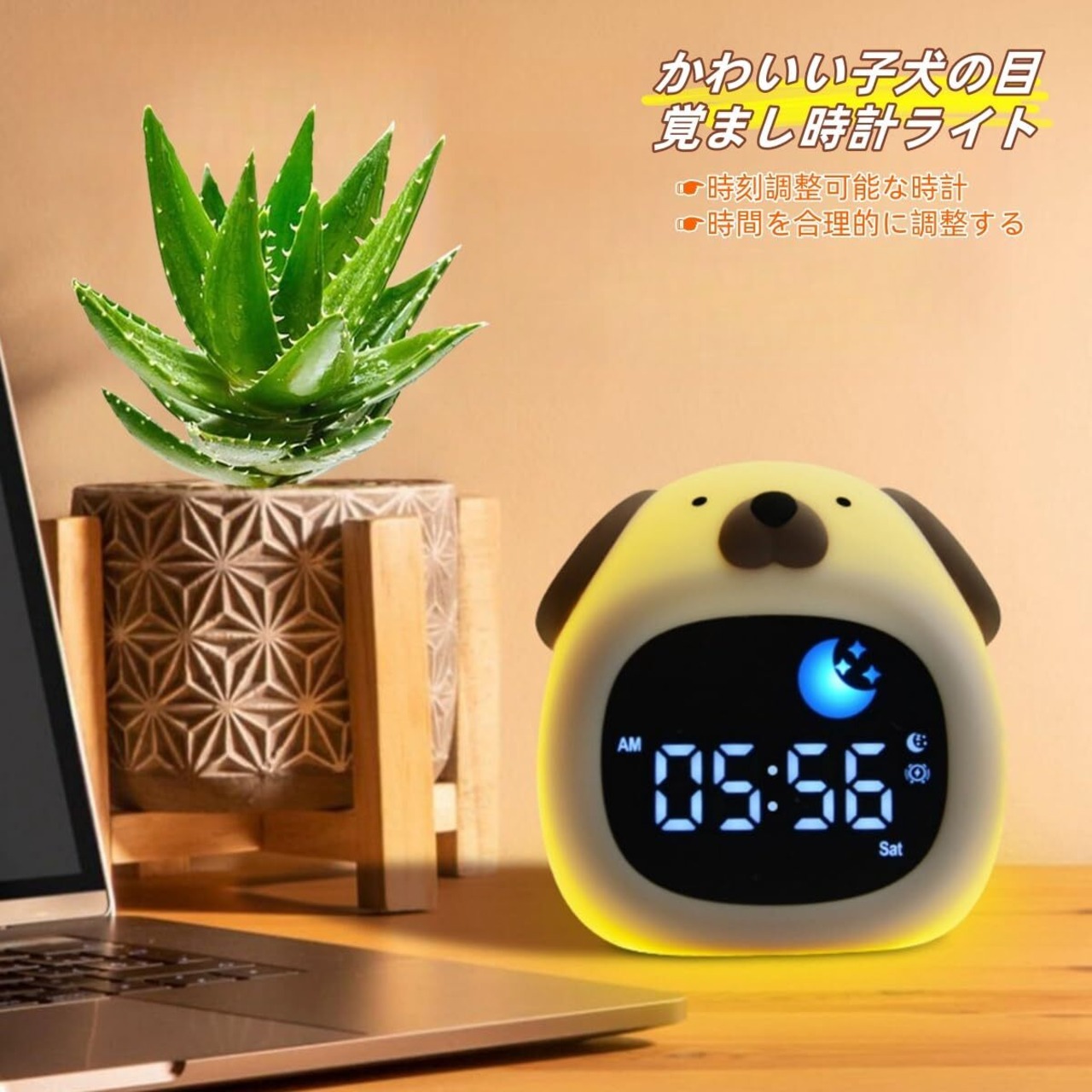 【マルチカラーライト】LEDスクリーンに鮮明なフォントで時間を表示できます。ナイトライトには明るい白色光と8色の光が備わっており、あらゆるシーンのニーズに対応します。子犬を優しく撫でると、光の明るさを自由に調整でき、視覚体験が快適になり、長時間使用しても目が痛くなりません。