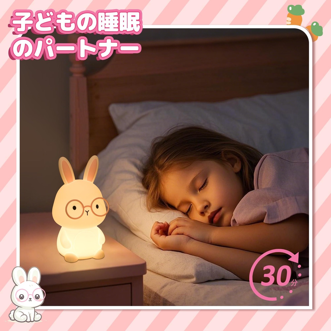 【面白いウサギのデザイン】このナイトライトは、ウサギの可愛らしさを反映したユニークなメガネ型ウサギのデザインを採用し、柔らかく落ち着いた雰囲気の光を放ちます。BPAフリーの安全なシリコン素材で、柔らかく決して暖かすぎない光、アンチブルーライトLEDはちらつきがなく、お子様の目を傷つけず、快適な睡眠をもたらします