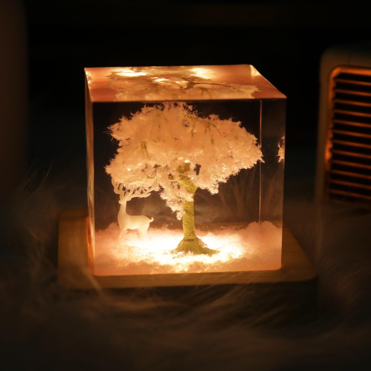 ユニークな外観:手作りのアイテム。各製品はユニークで、同じ完成品はありません。 全体的に透明感のあるナイトライト。内側にはピンクの桜の木、木の下にはムースがあり、カラフルなライトと木製のベースで、子供っぽく温かみのある雰囲気を作り出します。