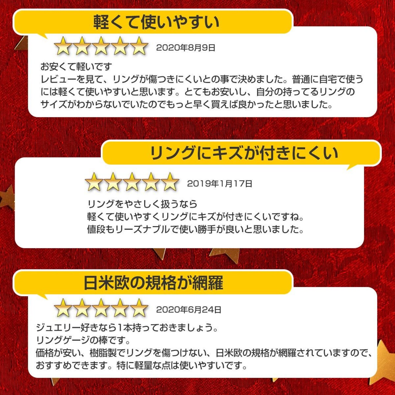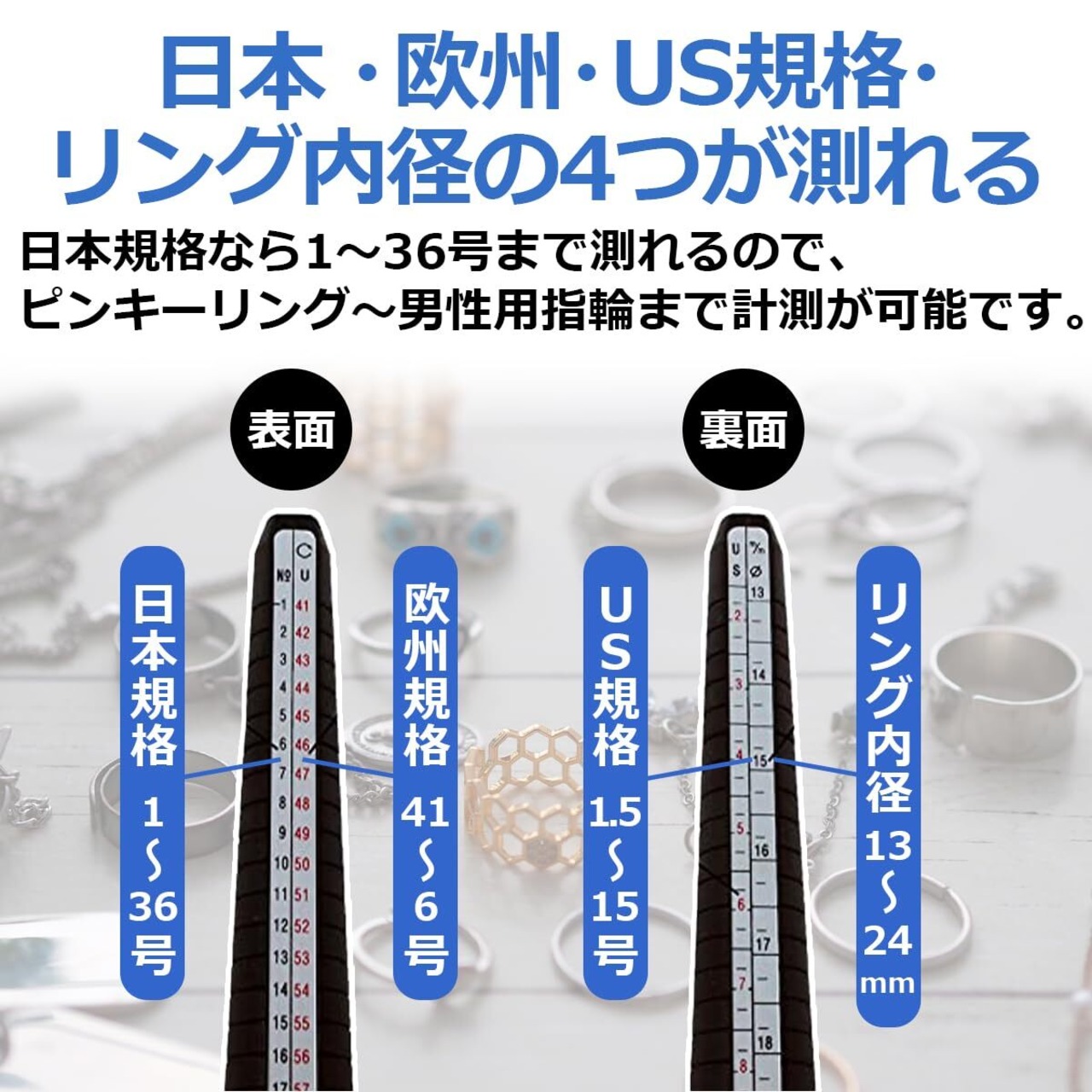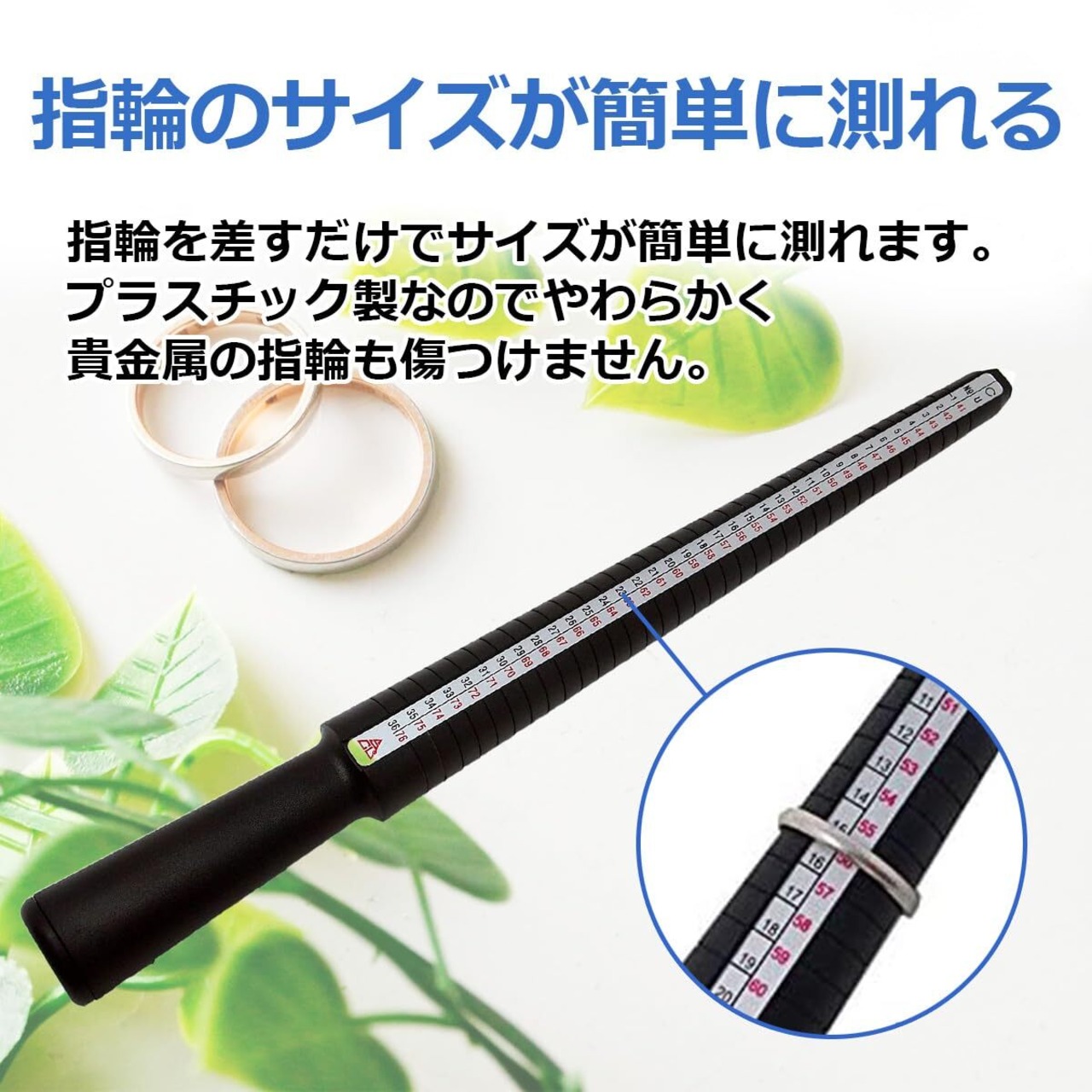 リング内周(単位:mm)と同じ数値なのでこれらも同時に測定できます。軽くて持ち運びに便利なプラスチック製で輸入業者やジュエリー店の方にも好評です。