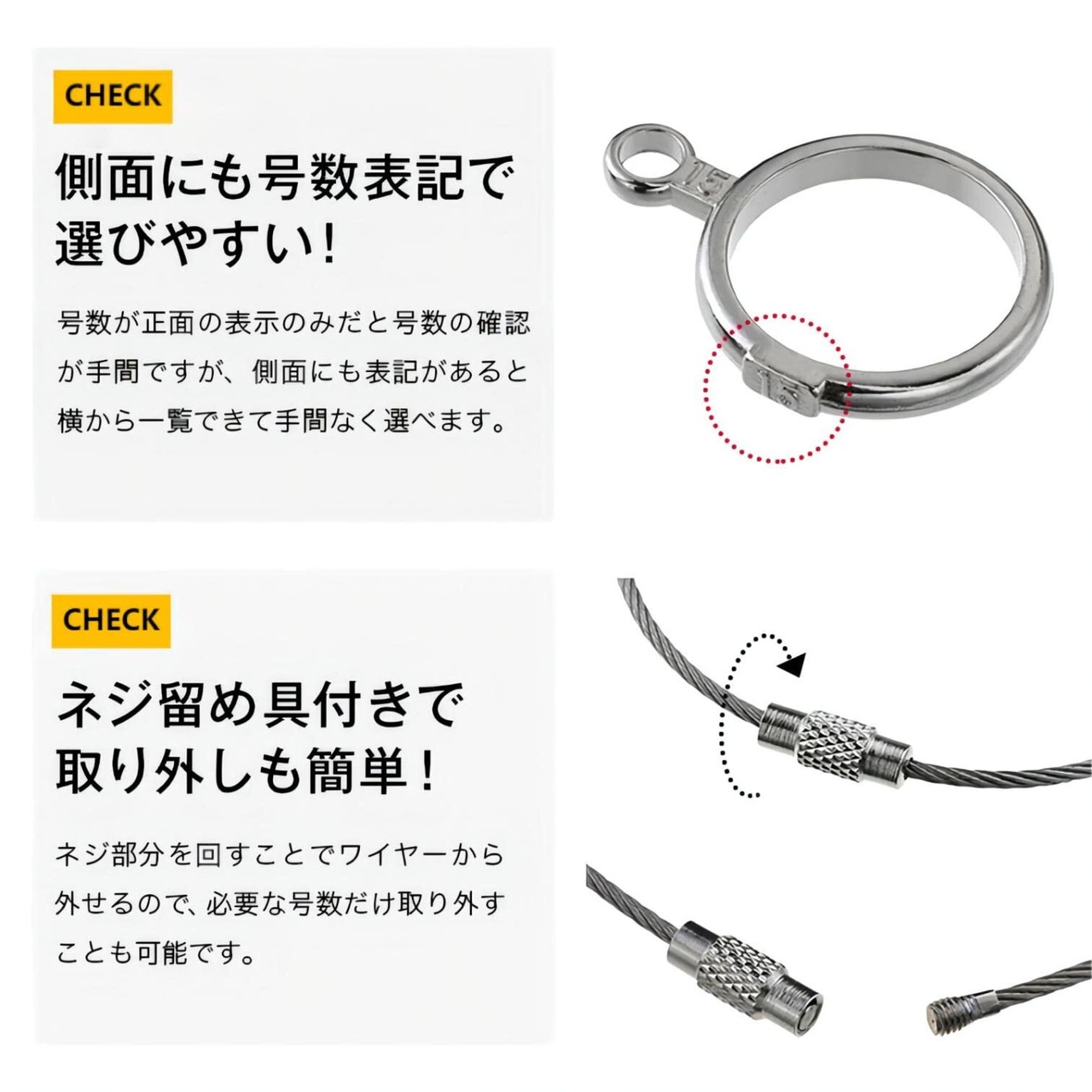 【測定時のご注意】リングゲージ 自体の重さで 指 と ゲージ の間に隙間ができ、実際の サイズ より緩くなる場合があります。測定時には、ワイヤーから外すか手のひらに接地させてお測り下さい。指輪を着ける指の腹より第二関節が太い方は、関節が無理なく通るサイズが適正なサイズとなります。