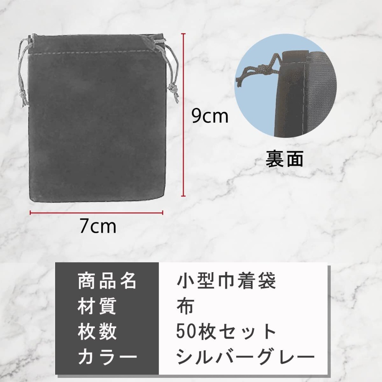 "シルバーグレー・7×9cm・50枚セットです。 肌触りのいいフランネル素材の巾着袋です。 "