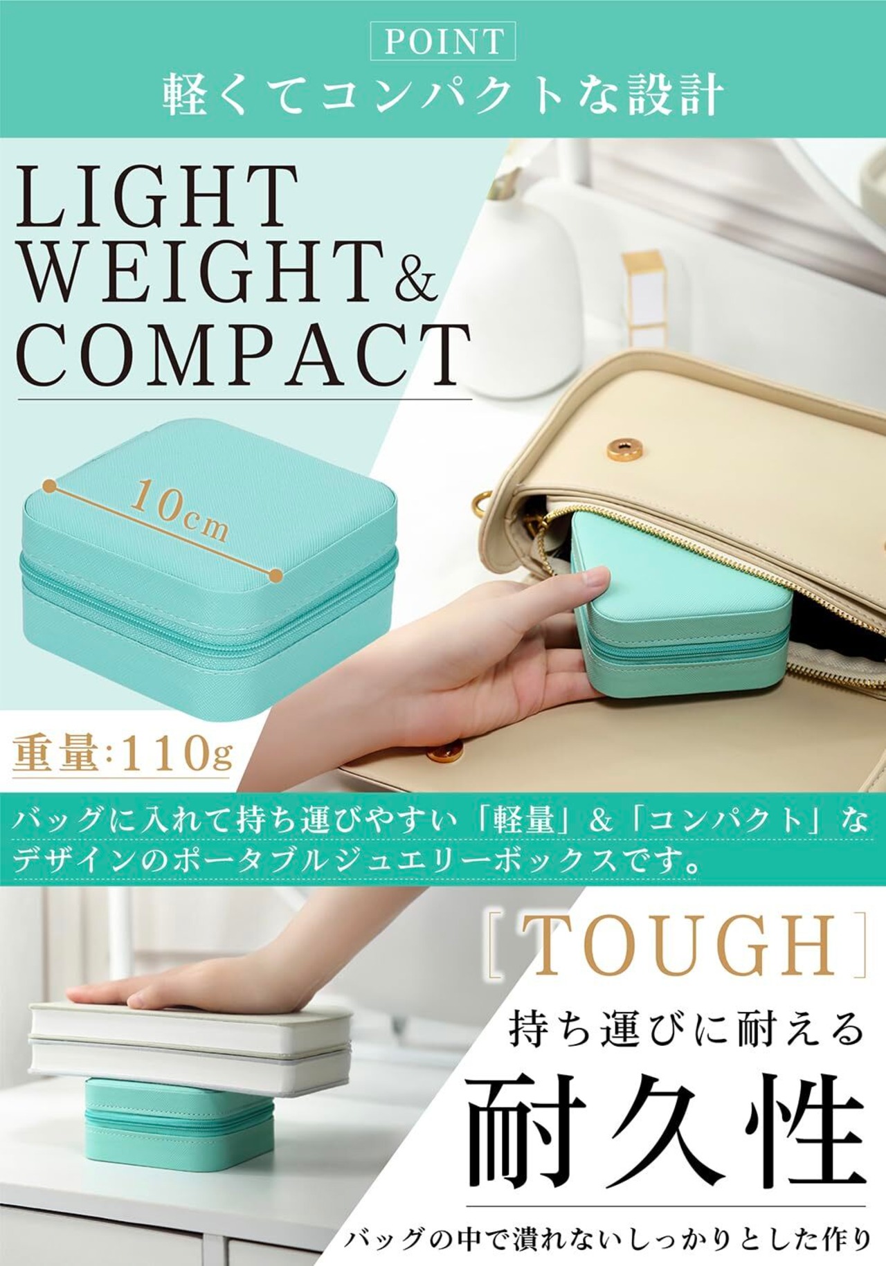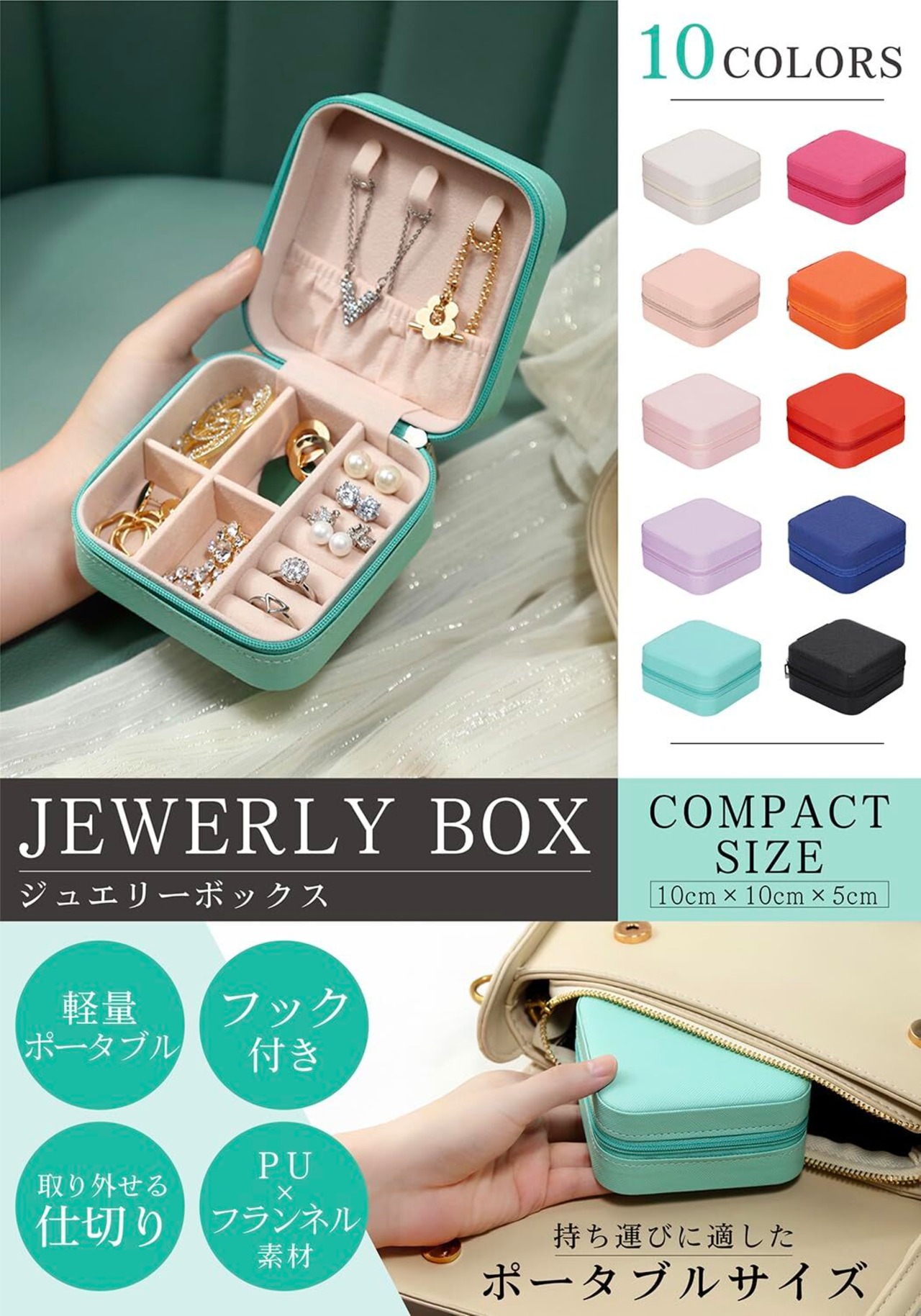 中の収納が充実:仕切り付きの小物収納、ネックレス用フックとポケットを完備。