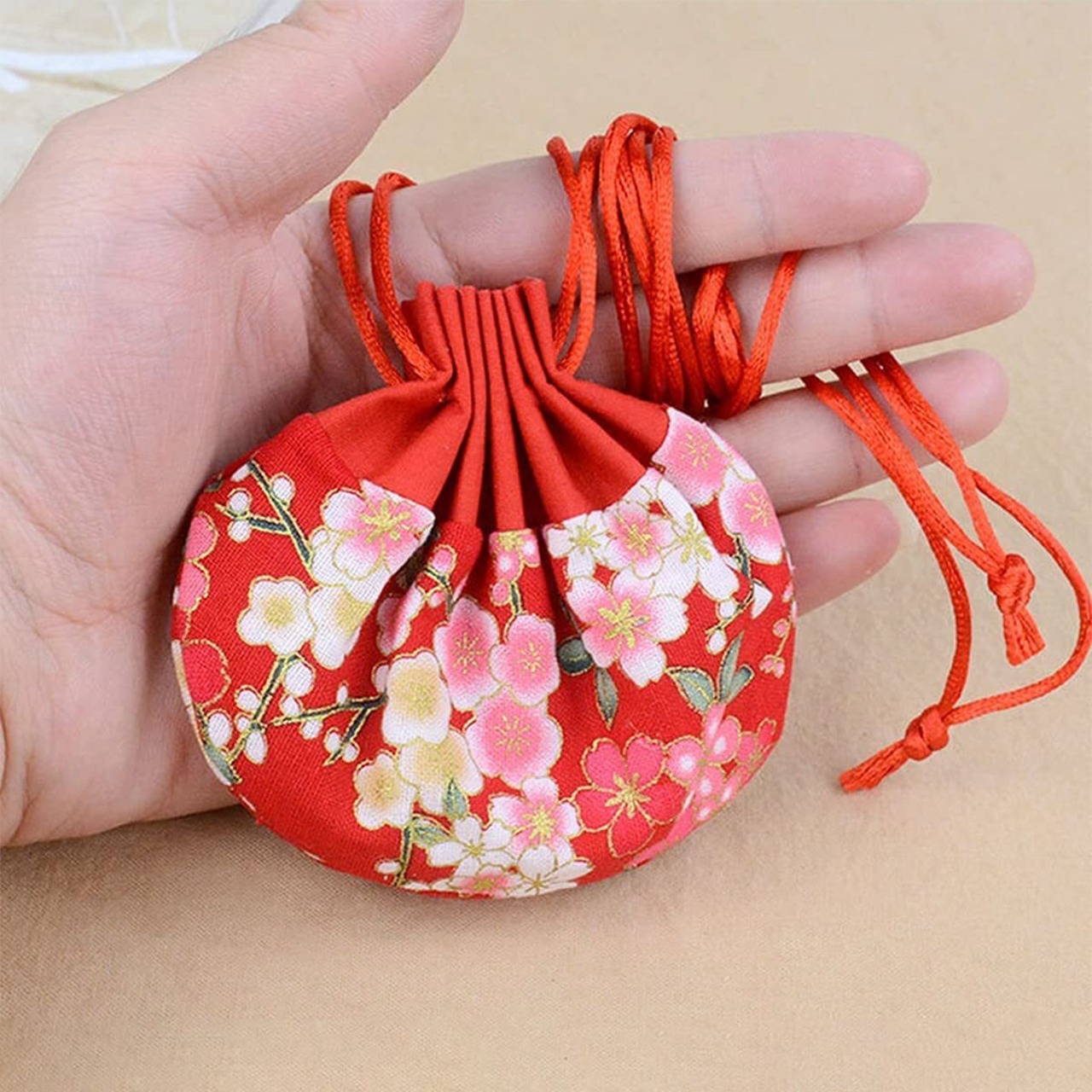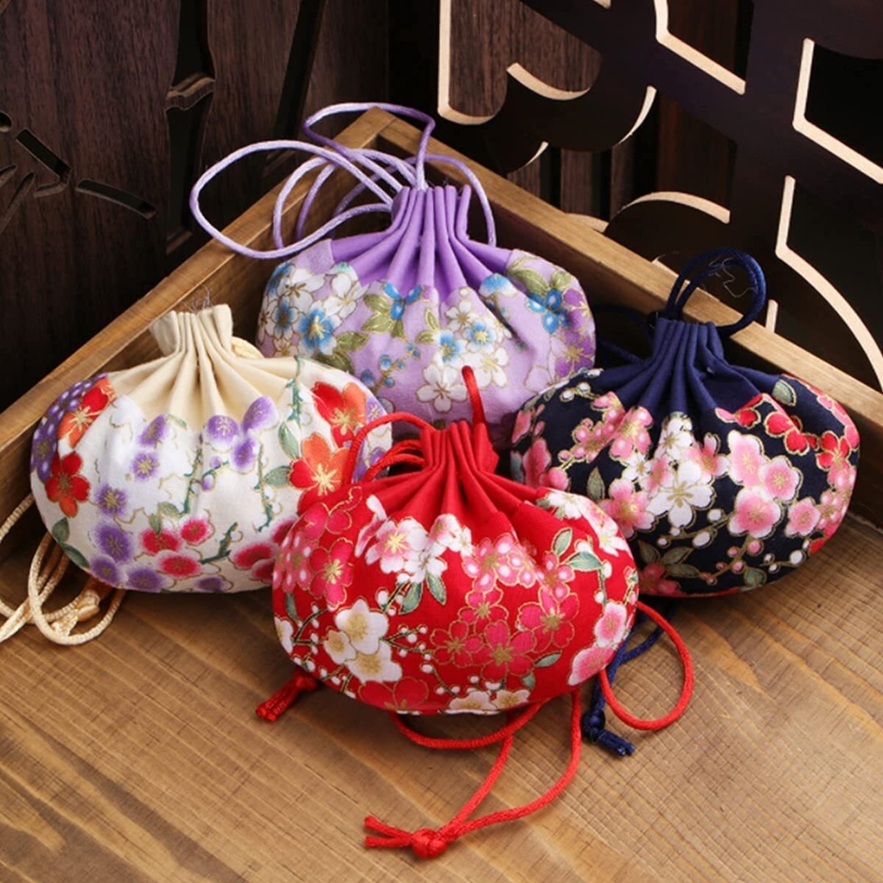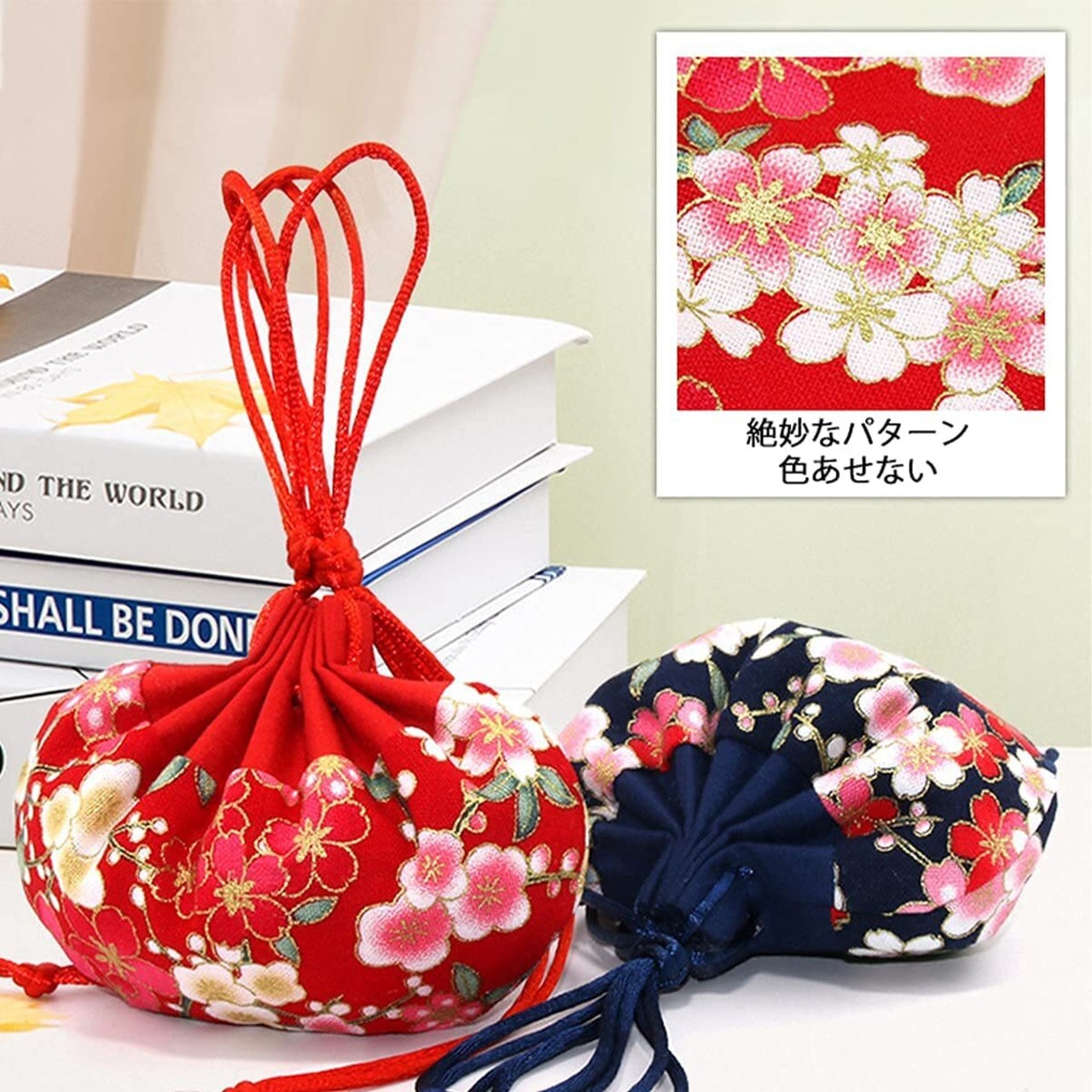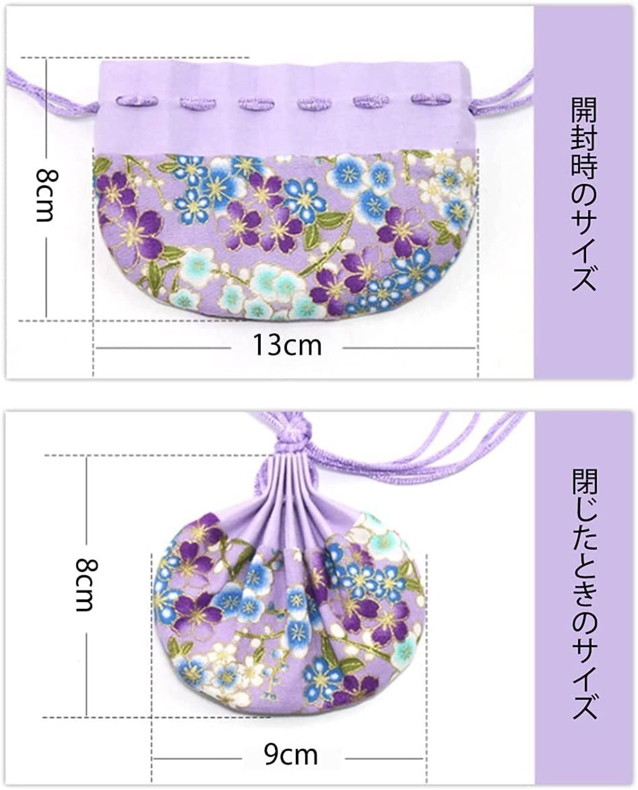 この巾着袋は、和風柄の可愛いデザインで、赤、ベージュ、紺、紫の4色がセットになっています。展開時のサイズは13x8cm、使用時のサイズは9x8cmで、綿麻の生地で作られています。匂い袋や香り袋作りに最適で、ネックレスやブレスレットなどの小物の収納袋やギフトバッグとしても使えます。高品質な縫製で、和服のアクセサリーとしてもピッタリです。