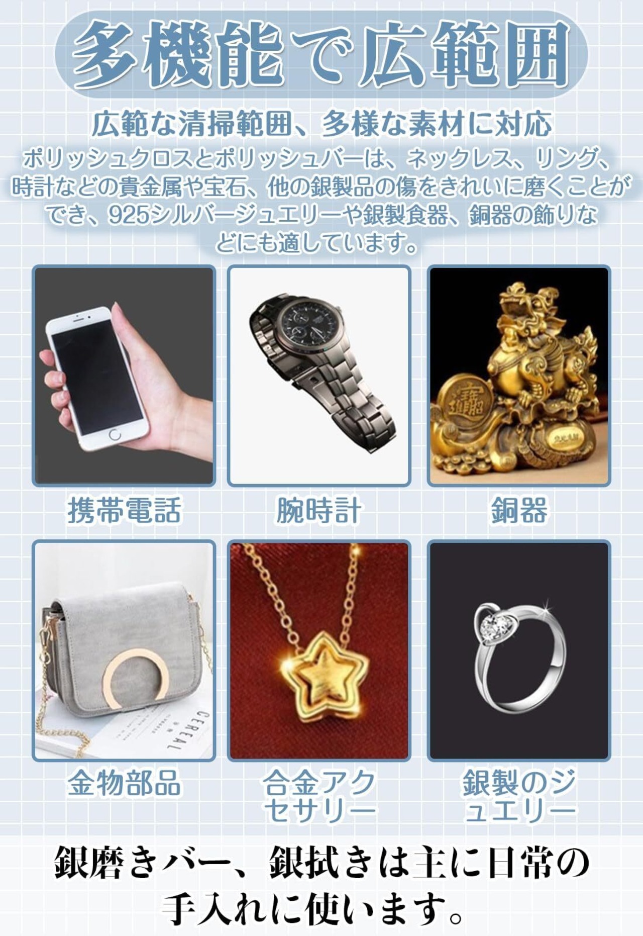 【オールインワンセットで仕上がりに歴然の差!】豊富なセット内容で黒ずみを除去するだけでなく、汚れ取りから艶出しまで対応しています。さらに保管用クロスも付属しているので、輝きを長期間持続することができます。