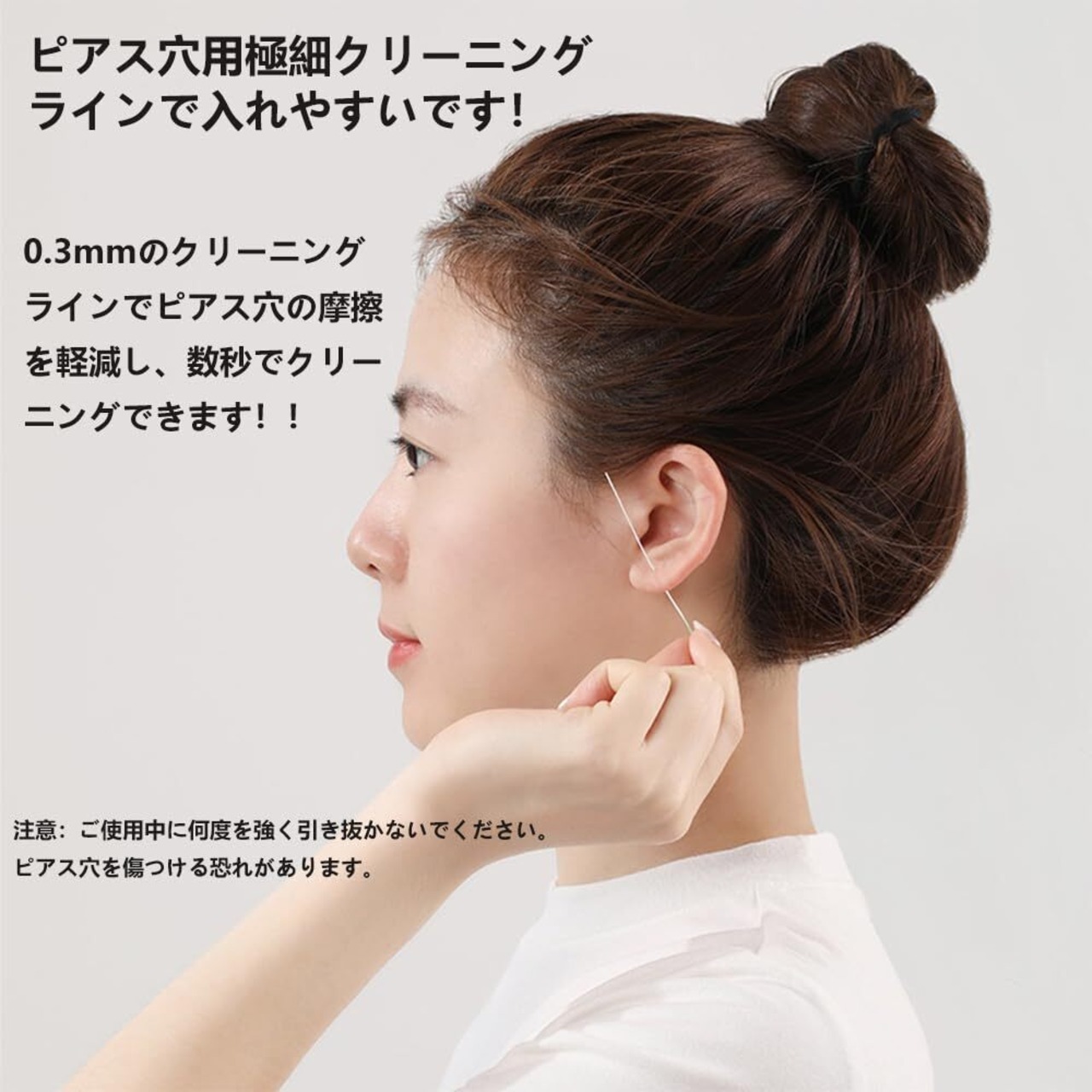 「3mmの太めクリーニングライン180本入り - ピアス穴専用おそうじフロス」 ピアスフロス史上最強の3mm太さ設計。ピアスの穴掃除に最適な強度で切れにくく、衛生管理がしやすい使い捨てタイプ。1日2本のピアスホール掃除を三ヶ月分(90回分)確保できます。