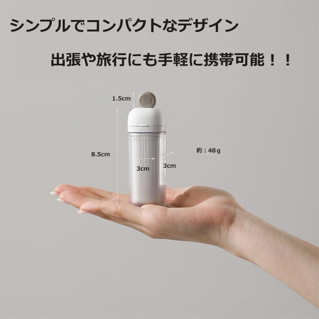 「超コンパクトボディ - ピアス掃除の携帯革命 」 化粧ポーチの隙間にも収まる10cmミニマム設計。外出先でのピアス掃除や旅行時のピアスホールケアに最適。48gの軽量ボディで、ピアスの穴専用おそうじフロスを常に携帯可能。