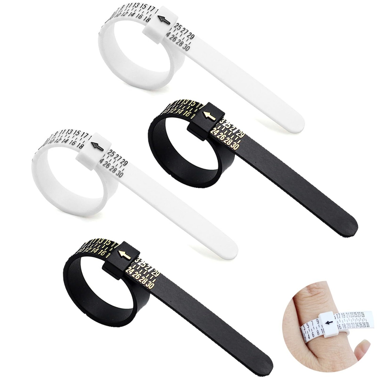 【セット内容】:セットには30個の異なるサイズの指輪測定リング(1番から30番まで)が含まれ、パッケージには4個の測定リング(白2個、黒2個)が付属し、各種の指輪サイズの測定ニーズを満たす。