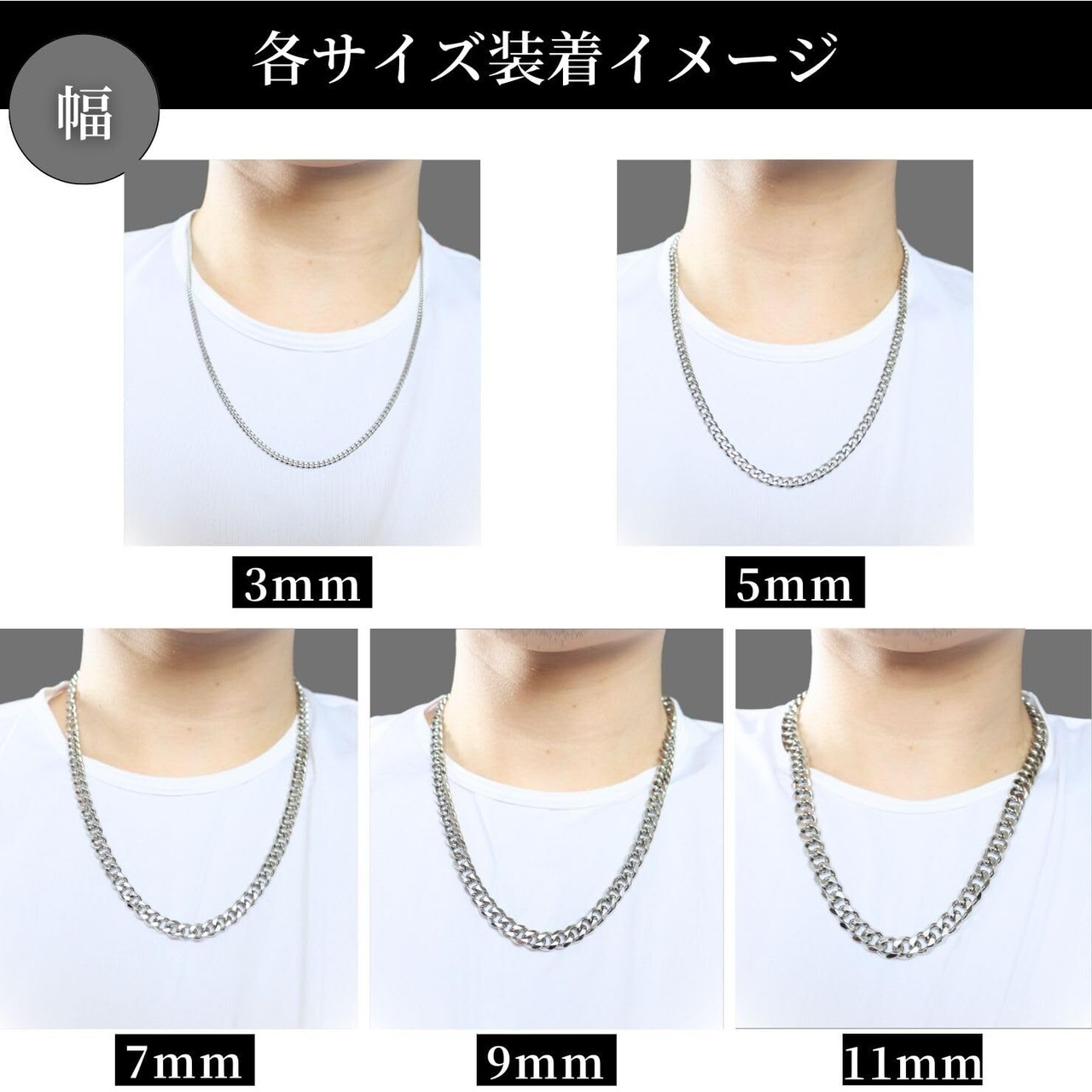 【豊富なバリエーション】カラーはシルバーとゴールド、チェーンの幅は3mm/5mm/7mm/9mm/11mm、長さは45cm/50cm/55cm/60cm/70cmの全50種類をご用意しております。スタイリッシュな印象の細めのデザインから存在感が抜群の太めのデザインまでお好みのデザインをお選びいただけます。※「商品の説明」より全サイズの画像がございますのでご参照くださいませ。また複数サイズを重ね付けしたり、お気に入りのペンダントトップを付けたり、様々な楽しみ方があるのでシンプルなのに飽きが来ない、そんなネックレスになります。