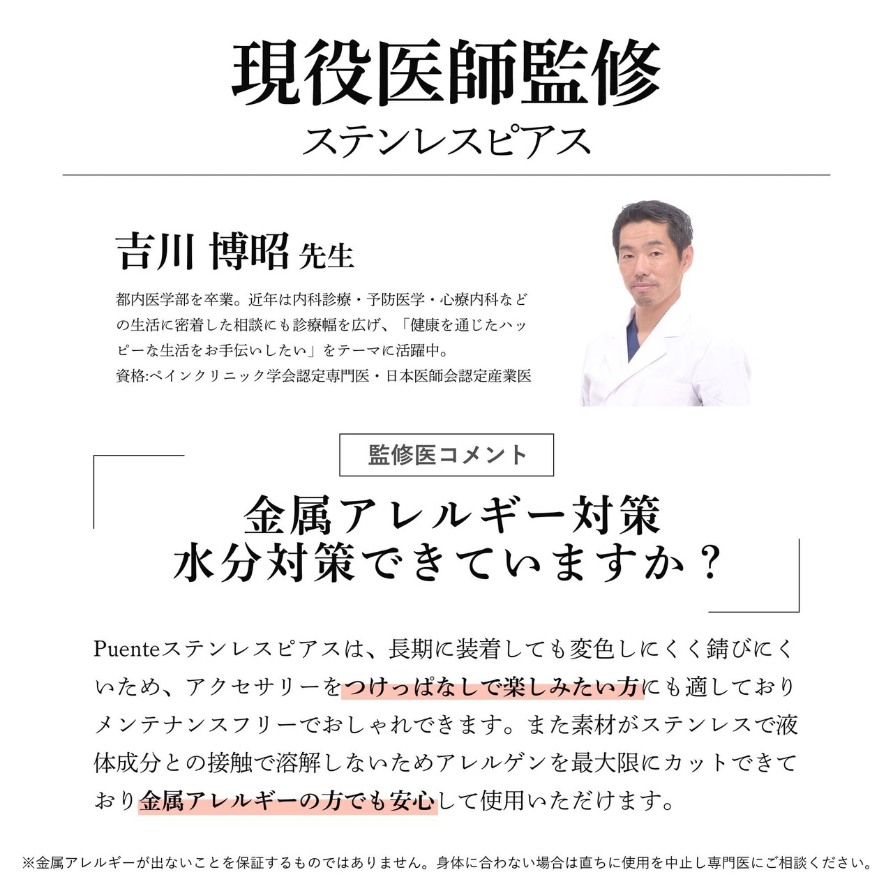 【金属アレルギー対応】 ステンレスは金属の中でもアレルギー性が極めて低い素材です。