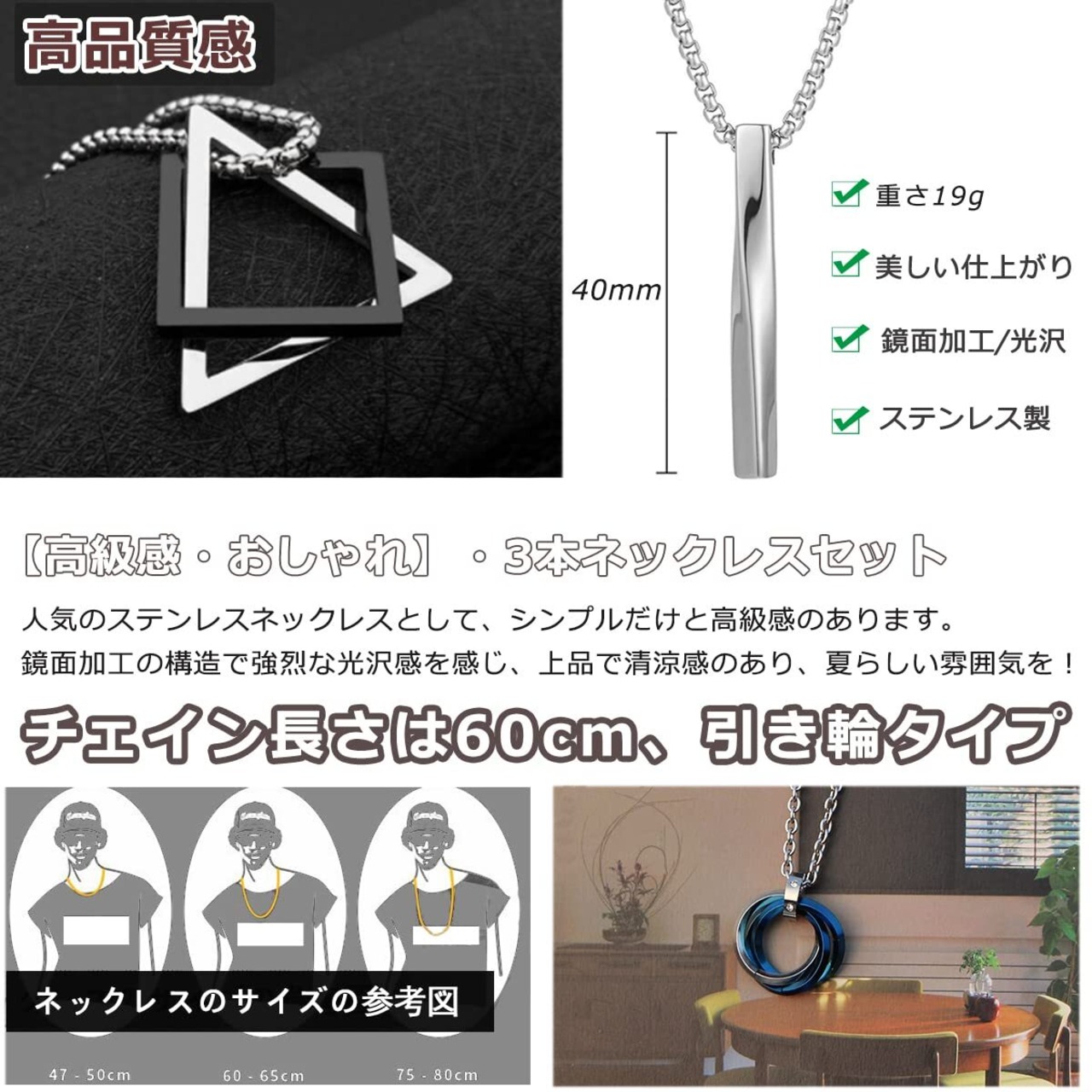【商品仕様】留め金具:引き輪タイプ固定、長さ55cm、幅3mm、幾何学デザイン、円形デザインとステックデザイン各一本、合計で3本入りのネックレスセットです。服装やニーズによって交換して使ったり、家族と一緒に使ったりできます。シンプルなコーデにネックレスを主役にさせることで、よりあか抜けた雰囲気に。丁度いいサイズ感、日常の服によく合わせます。