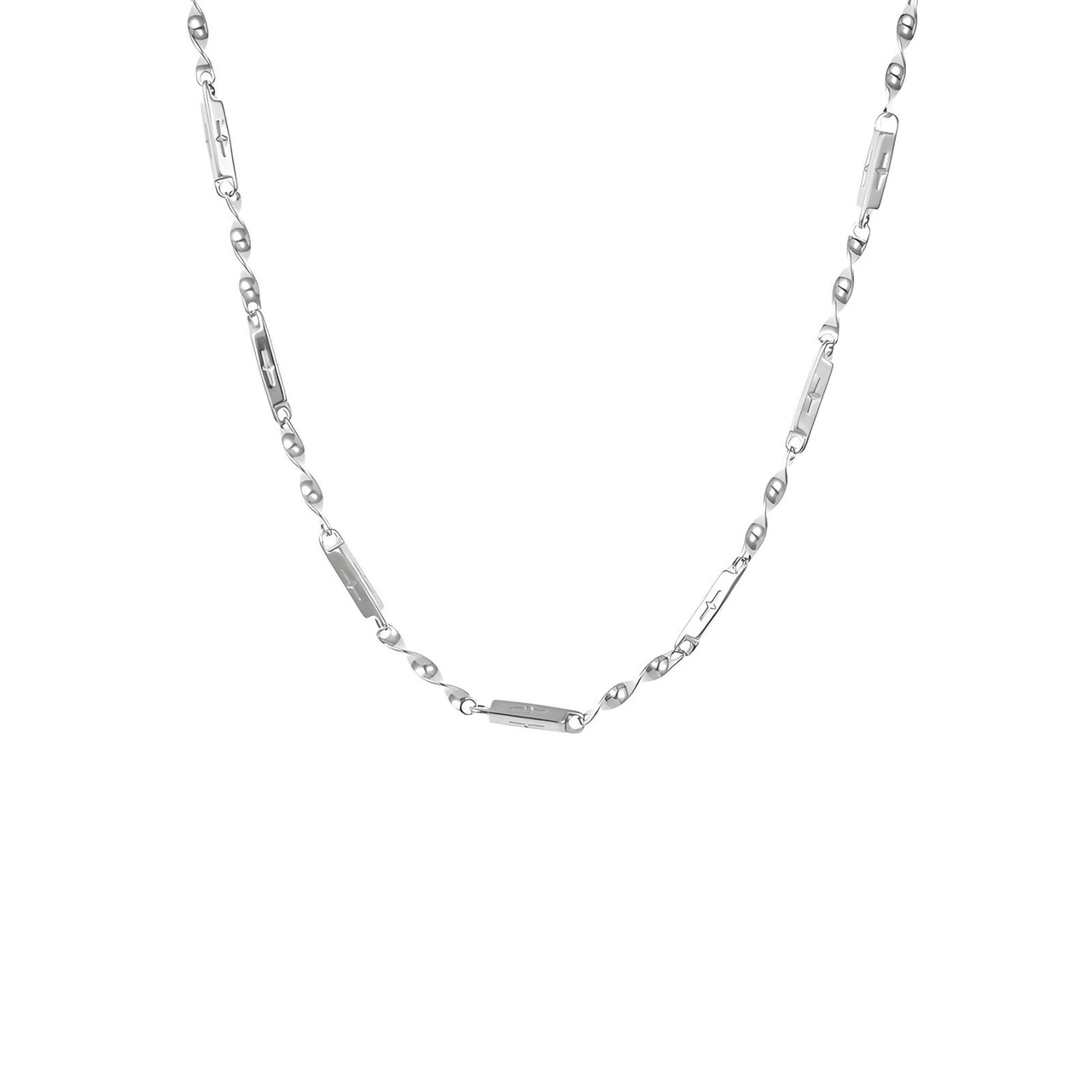 【デザイン】ステンレスチェーンのみ、二種類のパーツで構成され、一方はらせん状で、一方はクロスが刻まれる。シンプルなチェーン、程よい重さ、さりげなくおしゃれな雰囲気を引き立てます。