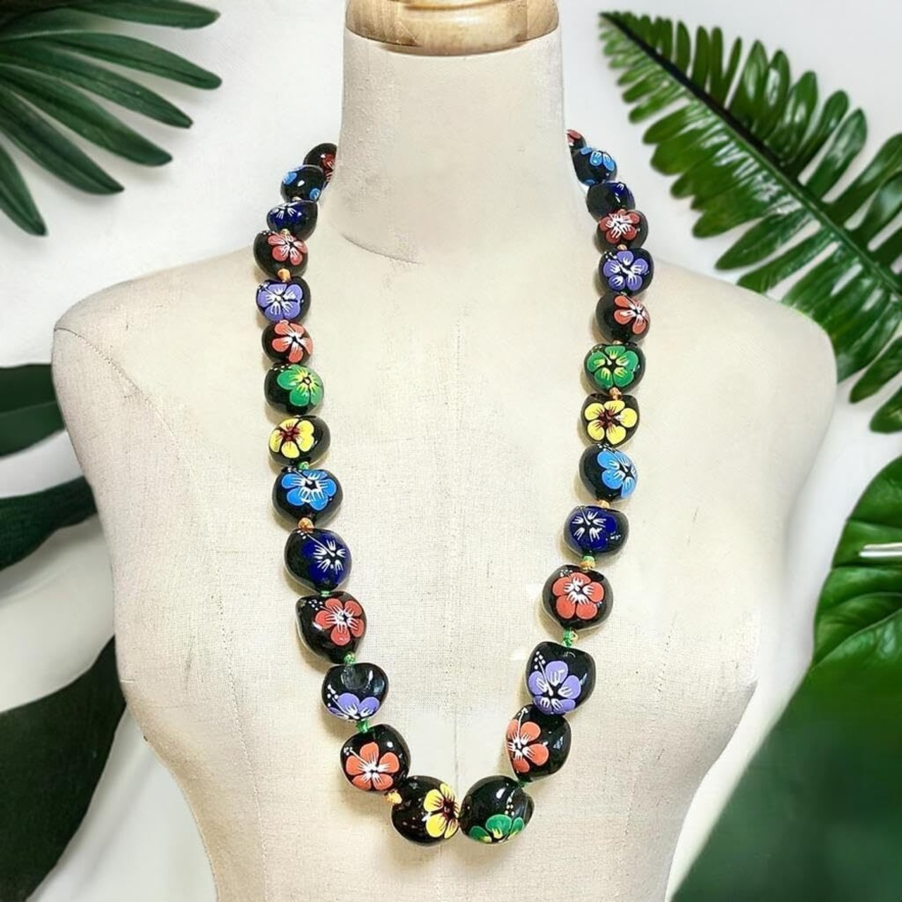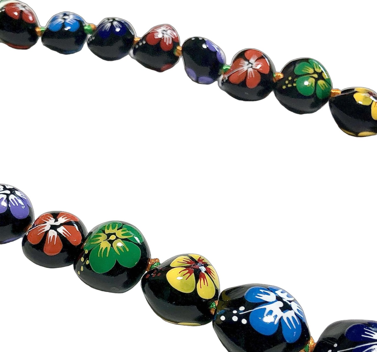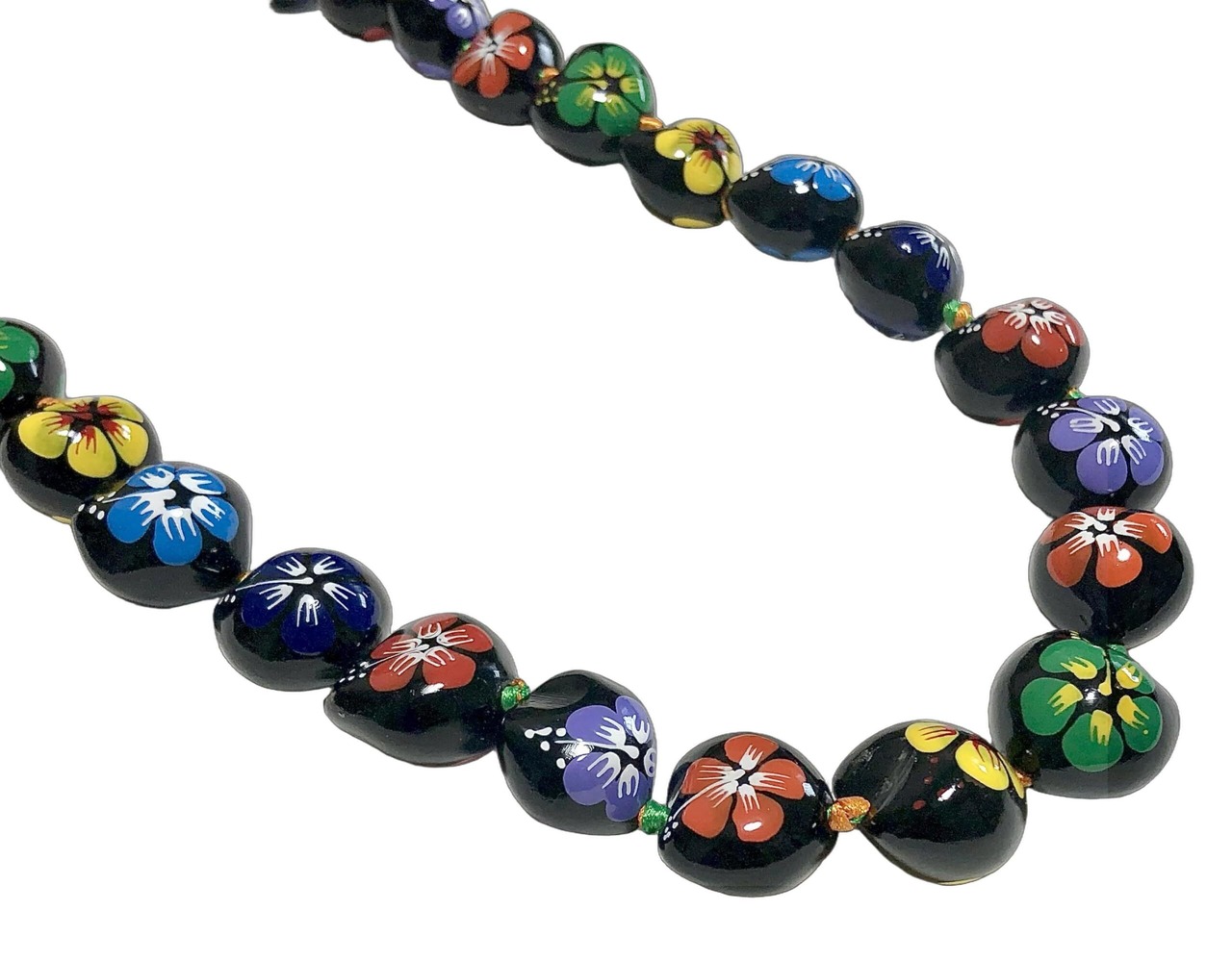 ククイナッツを1つ1つ丁寧に磨き上げ、職人により編み込まれた上質なブラックククイナッツにカラフルなハイビスカスがデザインされたレイです。