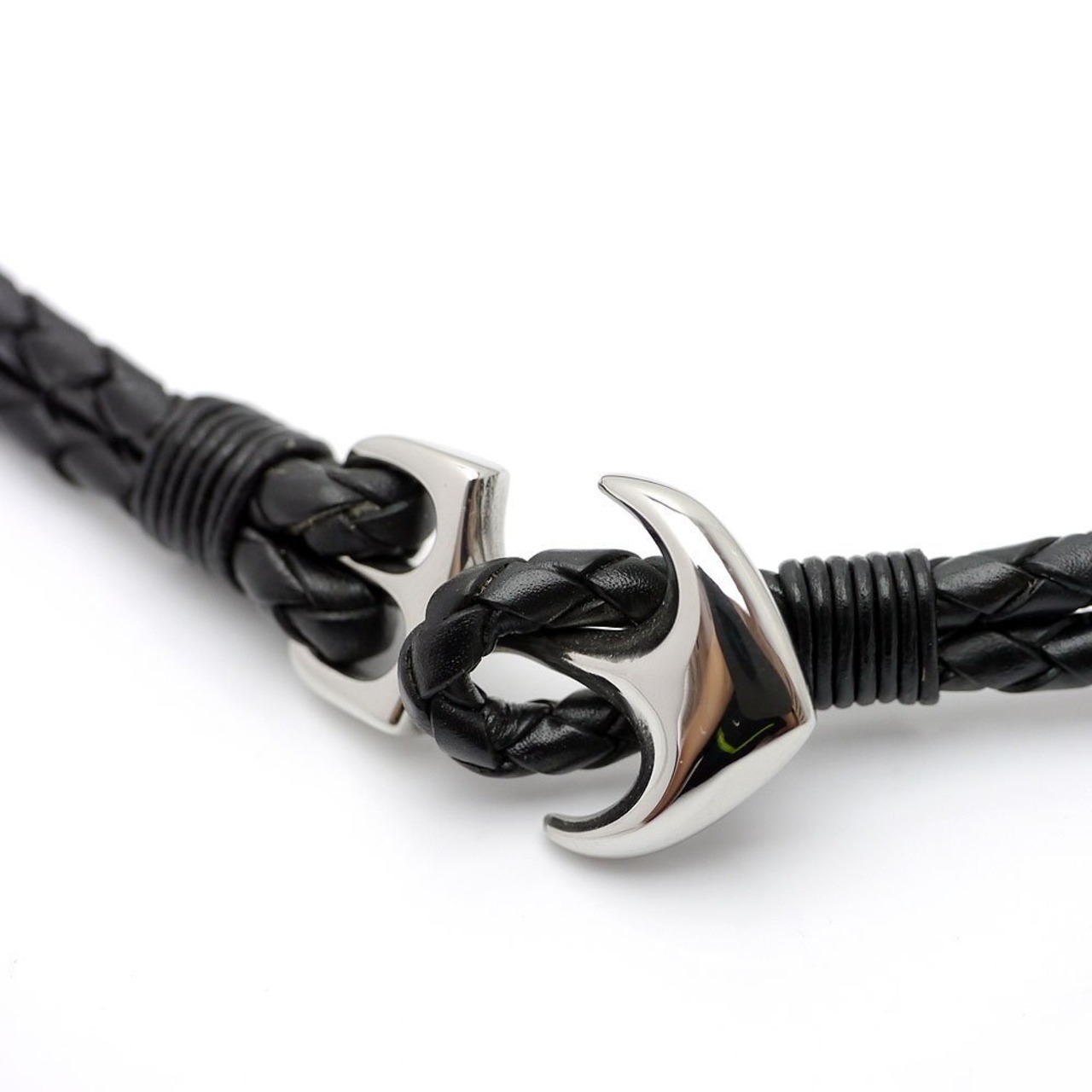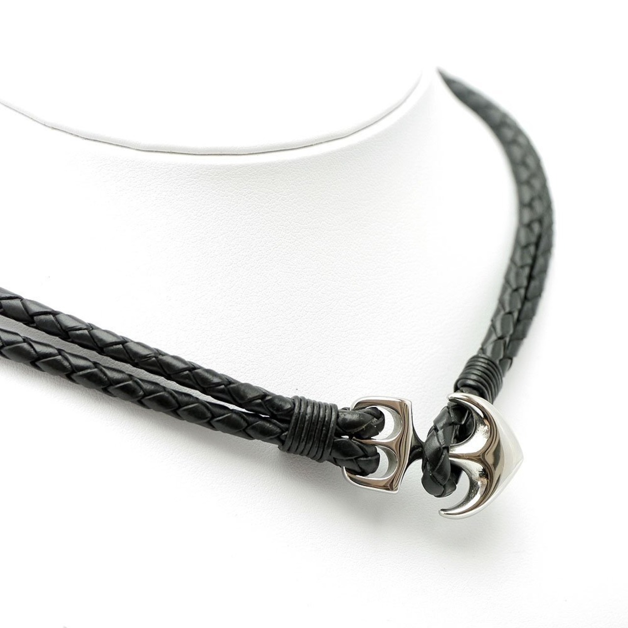 [シルバーワン] ko フロントフック レザーチョーカー アンカー 本革ダブル メンズ 編み込み ブラック ステンレス[4mm 47cm]