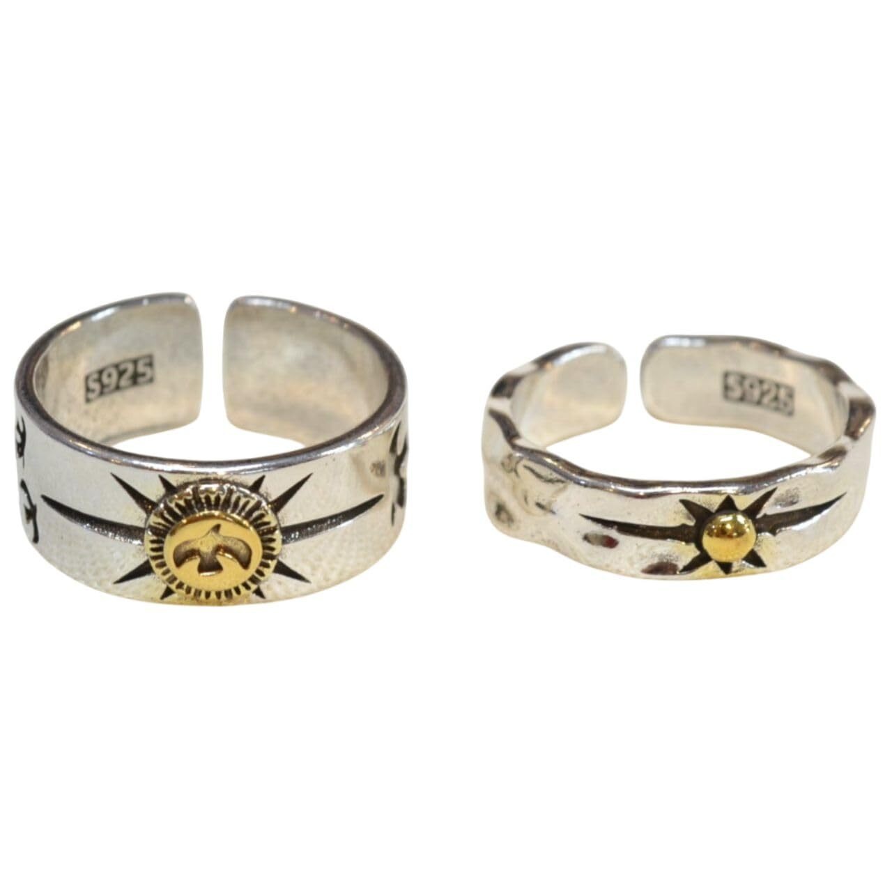 【デザイン】重厚で高級感あるクラッシックな風合い。中央にイーグルをかたどった太めの指輪、デコボコした表面のごつい印象の太陽をかたどった指輪の2種類を用意しました。