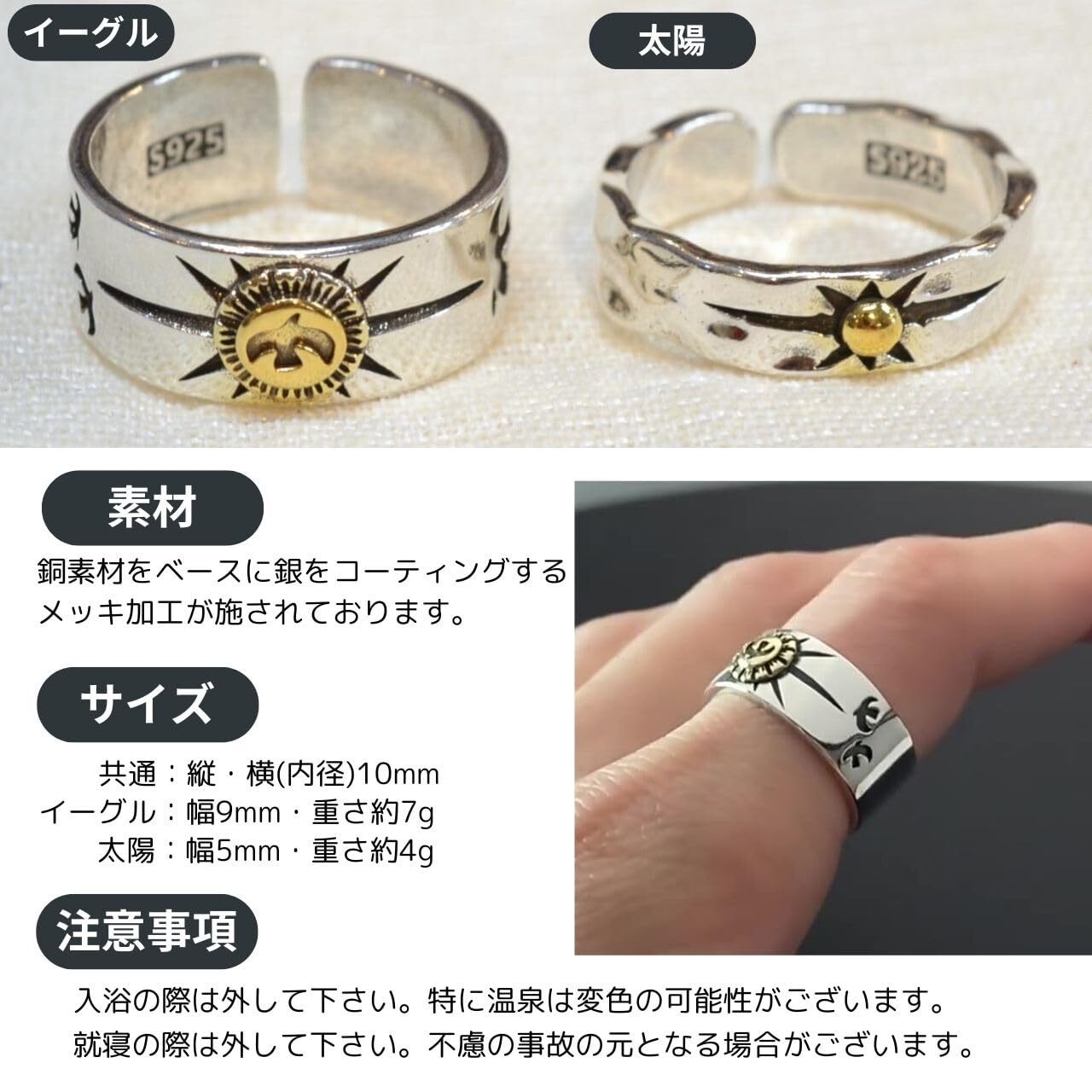 【サイズ・重量】共通:縦・横(内径)10mm / イーグル:幅9mm・厚さ1.5mm・重量約7g / 太陽:幅5mm・重量約4g。小型でかさ張らないので、記念日などのプレゼントにもオススメ。