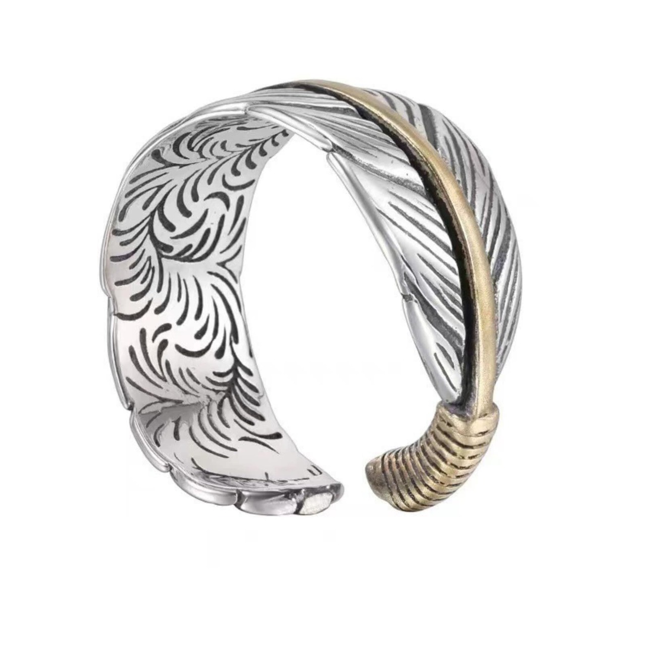 【自由と強さを象徴するフェザーリング】イーグルの羽根をモチーフとしたフェザーデザインのリングです。特に羽根をモチーフにした物はネイティブ系ジュエリーや、インディアン調のファッションでよく登場します。フェザー×鷲の意味は、「魂の自由」「真の強さ」「守られている」という意味があります。羽(フェザー)モチーフの意味・・・「飛躍」や「運気上昇」という意味を持っています。