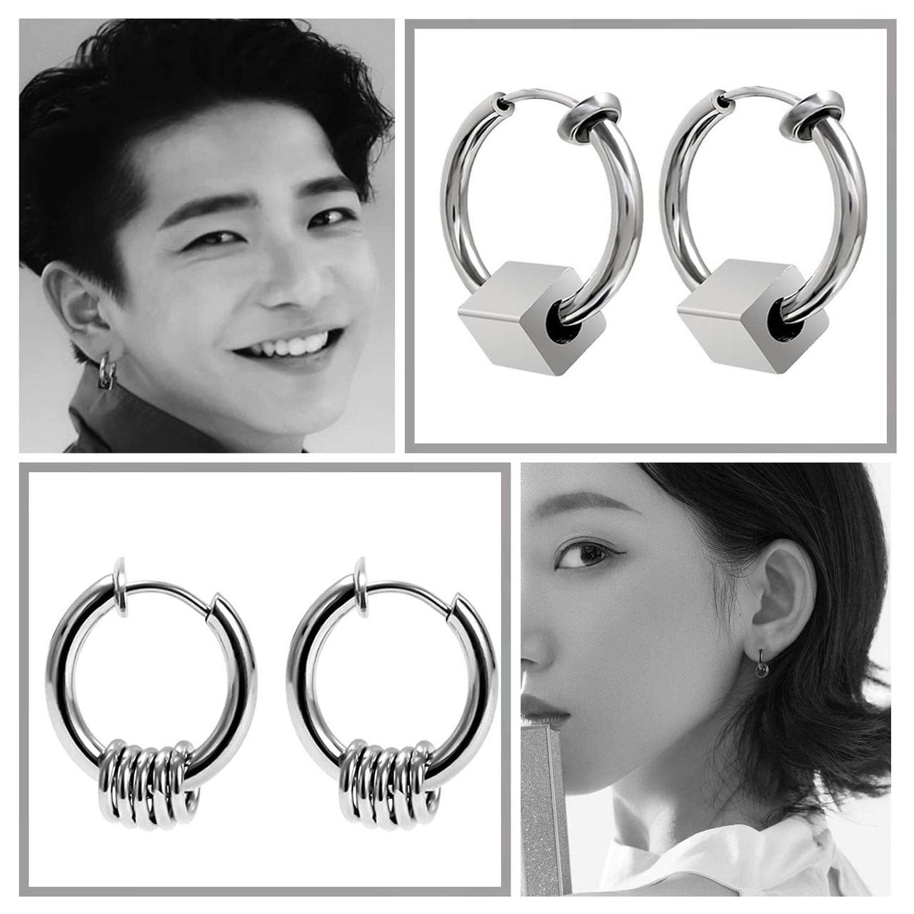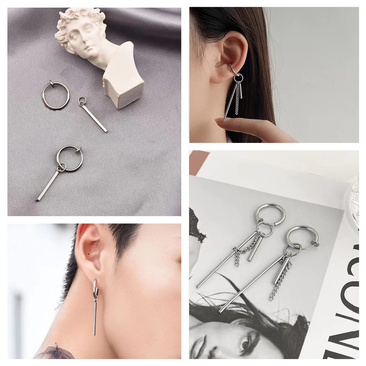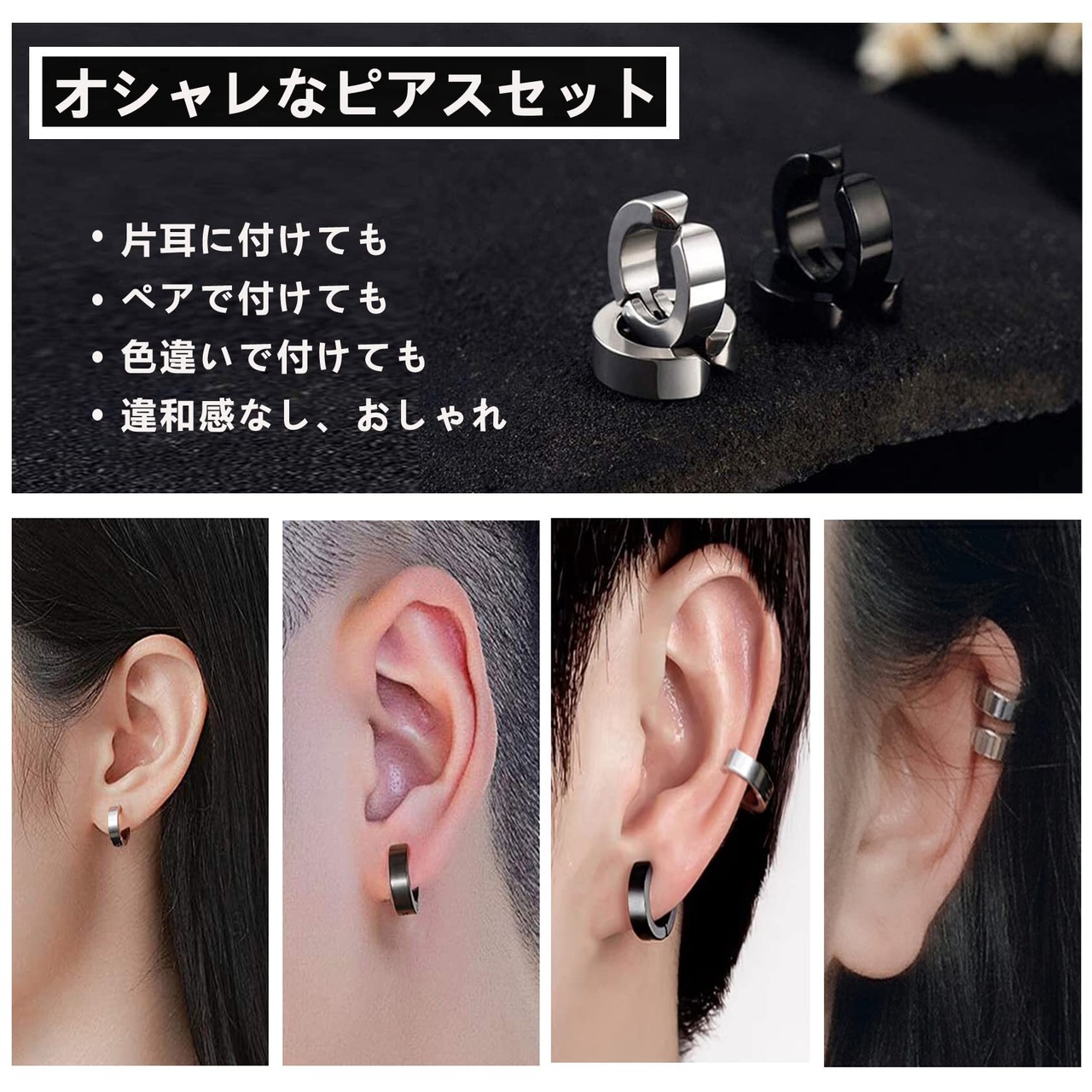 【お得な6ペア12個セット】セット内容:フェイクピアス6ペア、12個、収納ポーチ1個。ノンホールもオシャレに楽しめるフェイクピアス、イヤーカフ、イヤリング、ノンホールピアスです。イヤリングのパーツは付けた、外したりできるし、リングとパーツのサイズも違いますから、自由に組み合わせることによって異なるスタイルを楽しめます。イヤリングをペアでつけたり、片耳だけで付けたり、重ね付けたり、ブラックととシルバー色違いで付けたりし、イヤリングのパーツを外したら、フープピアス、イヤーカフ、軟骨ピアスなどとして10個以上の付け方法があります。